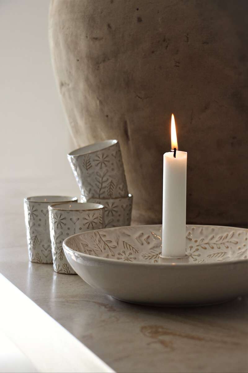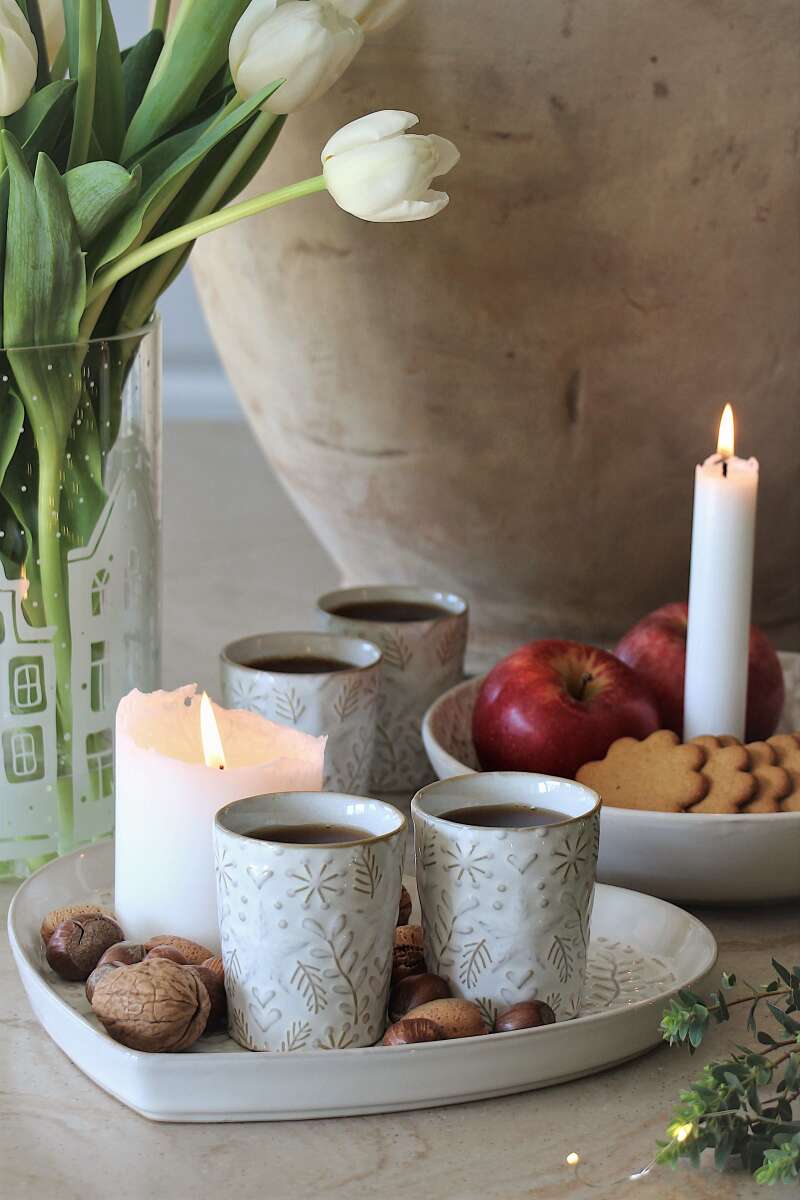 Artikelnummer: 52308Kleiner Becher, ø6x7cm, Keramik. Handgefertigte Steinzeugserie mit geprägtem Muster in wunderschöner lebendiger Ausführung. Finish weisse reaktive Glasur. Reaktive Glasur bedeutet, dass die Glasur aufgrund des Feuerprozesses und des handgefertigten Prozesses einige Farbabweichungen aufweisen kann . Reaktive Glasur verleiht der Keramik ein rustikales, natürliches Finish, das wir lieben. Langlebiges Steingut, geeignet für Spülmaschine und Mikrowelle.