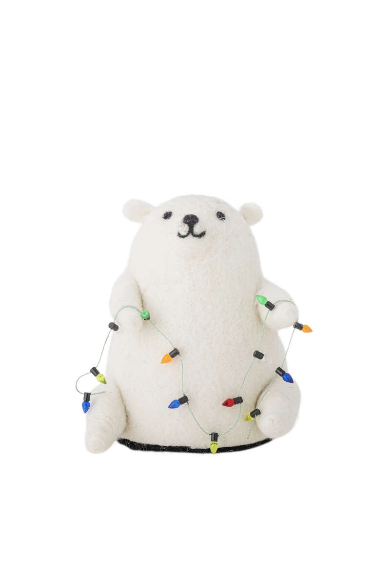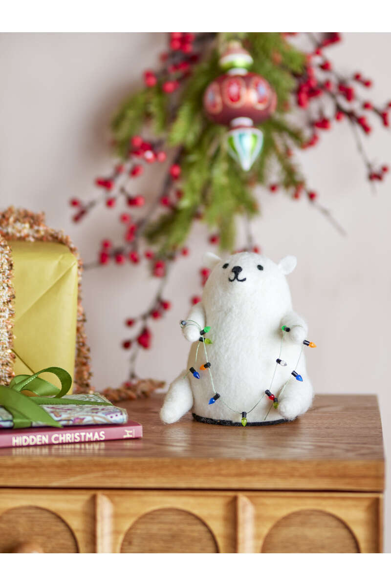 Die Wally Deko mit Licht von Bloomingville ist ein aus Wolle gefilzter Polarbär, der eine bunte Lichterkette in den Armen hält. Dieser entzückende Polarbär leuchtet mit einem warmen, weißen Licht und fügt jeder Umgebung eine gemütliche Atmosphäre hinzu. Perfekt als Teil der Winterdekorationen, auf einem Regal oder auf der Fensterbank, wo er während der kalten Monate Freude und Wärme verbreiten kann. L14xH15xW12 cm. (Braucht 3x AAA Batterie, nicht enthalten)