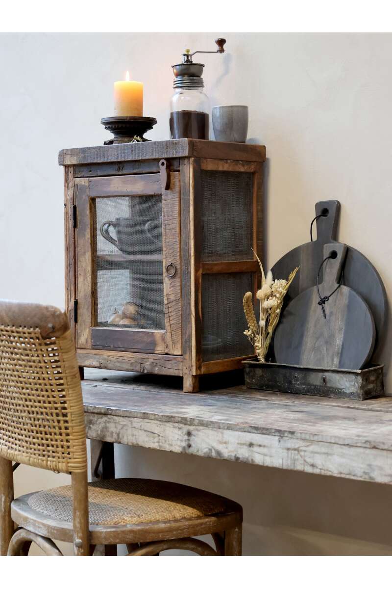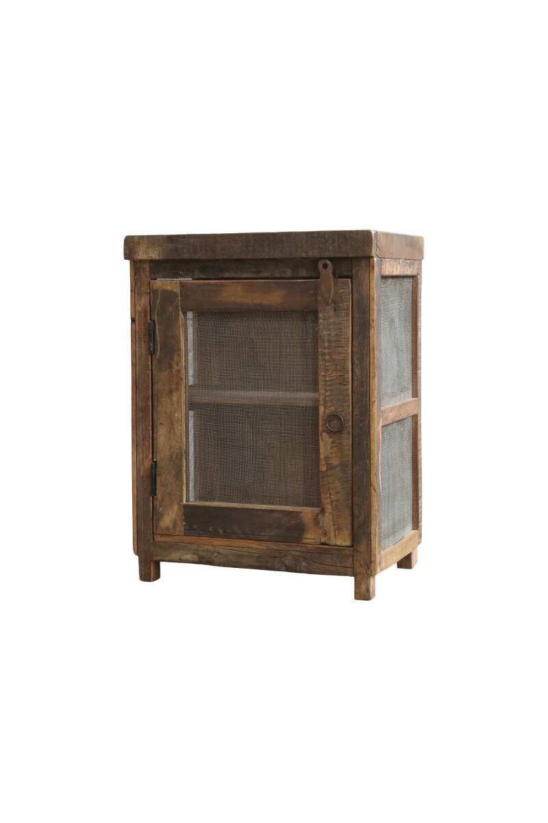 Artikelnummer: 47493Der Schrank ist in Indien aus Recyclingholz von Abbruchmaterial hergestellt. Das Holz hat daher Knorren, Risse, Sprünge und Splinter, und die Holzart variiert, jeder ist ein Unikat und sehr rustikal verarbeitet, B: 40 H: 54 T: 26cm