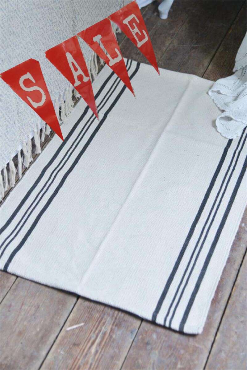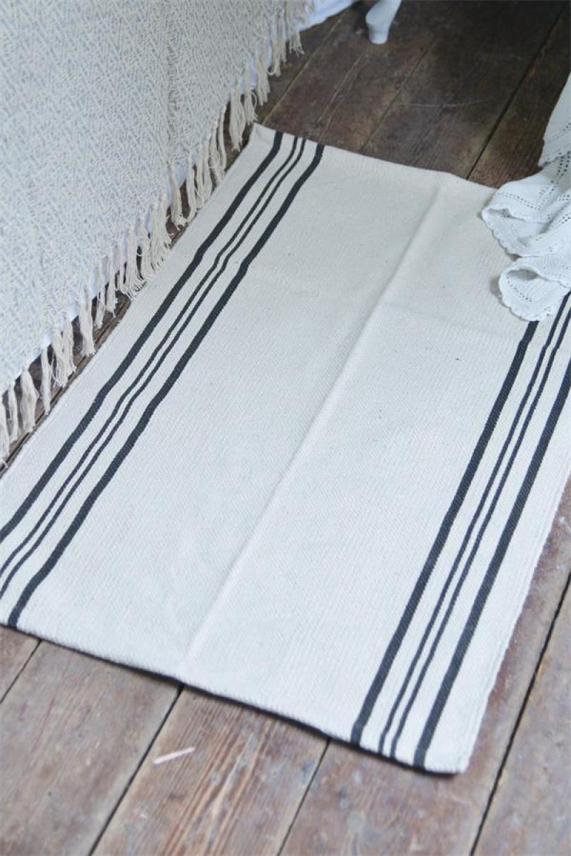 *statt 24.90* Fein gewebter Teppich mit cremefarbenem Boden und bedruckten Streifen, 60x90cm, der Teppich hat ein abgenutztes Aussehen, das leicht variieren kann - dies macht jeden Teppich einzigartig. Der Teppich besteht aus 100% Baumwolle und kann bei 30 Grad von Hand gewaschen werden.