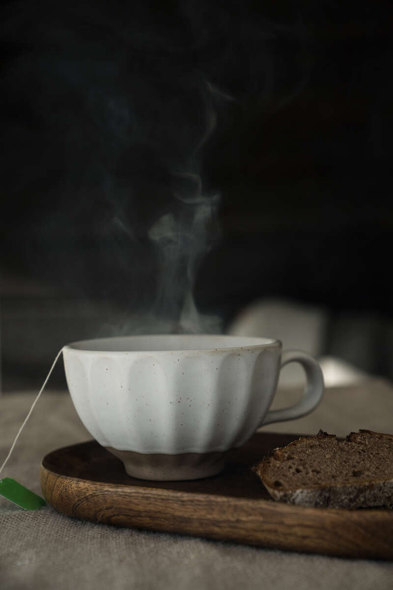 Eine Teetasse aus weich geformter Keramik mit natürlicher Glasur, ø11,8 x H 6,8cm. Schön in den Händen zu halten – für Momente, in denen man in Ruhe landen möchte.