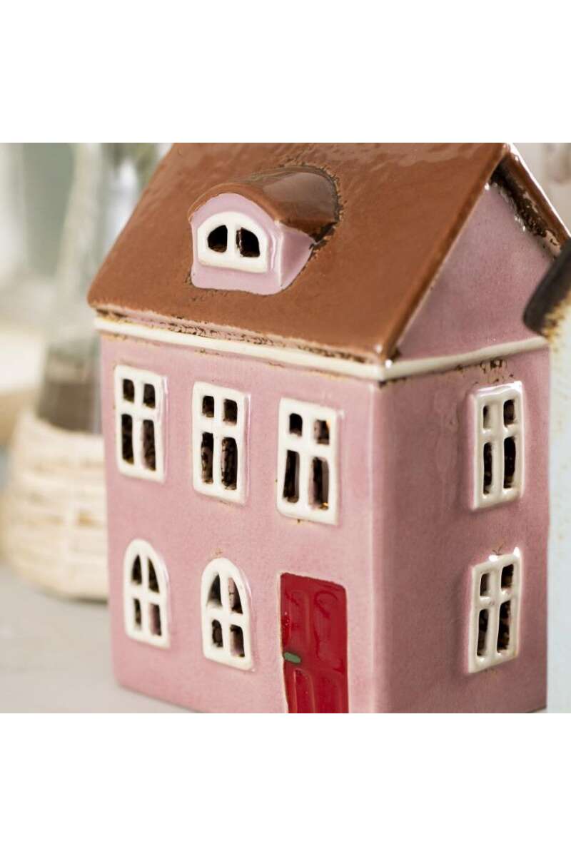 Keramikhaus für Teelicht, B: 9 H: 15,5 L: 11cm. Wer liebt sie nicht, die schönen Nyhavn-Häuser mit ihren süßen kleinen Details und der glänzenden Keramik? Die Häuser sind vom Hafenviertel Nyhavn in Kopenhagen inspiriert, das für seine farbenfrohen Häuser bekannt ist, von denen jedes eine einzigartige Geschichte und einen etwas skurrilen Ausdruck hat. Die charmanten Keramikhäuser können alleine stehen, zwischen Töpfen und Pflanzen platziert oder in einer Reihe aufgereiht werden, um eine kleine Nachbarschaft zu schaffen. Die Nyhavn-Häuser schaffen eine reizvolle Atmosphäre, wo immer sie aufgestellt werden und wenn ein brennendes Teelicht aufgestellt wird, sorgen sie für eine harmonische Wohlfühlatmosphäre. Beim Glasieren von Keramik herrscht immer ein gewisses Mass an Unvorhersehbarkeit und während des Brennens werden die Farben lebendig. Genau das verleiht den kleinen Häusern ein einzigartiges und originelles Aussehen, mit kleinen Farbunterschieden und rustikalen Kanten.