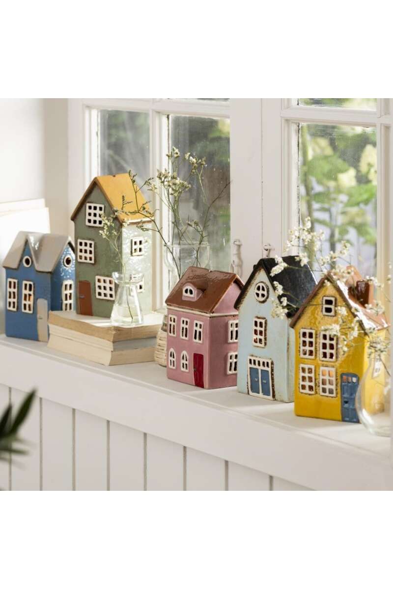 Artikelnummer: 54578Keramikhaus für Teelicht, B: 9 H: 15,5 L: 11cm. Wer liebt sie nicht, die schönen Nyhavn-Häuser mit ihren süßen kleinen Details und der glänzenden Keramik? Die Häuser sind vom Hafenviertel Nyhavn in Kopenhagen inspiriert, das für seine farbenfrohen Häuser bekannt ist, von denen jedes eine einzigartige Geschichte und einen etwas skurrilen Ausdruck hat. Die charmanten Keramikhäuser können alleine stehen, zwischen Töpfen und Pflanzen platziert oder in einer Reihe aufgereiht werden, um eine kleine Nachbarschaft zu schaffen. Die Nyhavn-Häuser schaffen eine reizvolle Atmosphäre, wo immer sie aufgestellt werden und wenn ein brennendes Teelicht aufgestellt wird, sorgen sie für eine harmonische Wohlfühlatmosphäre. Beim Glasieren von Keramik herrscht immer ein gewisses Mass an Unvorhersehbarkeit und während des Brennens werden die Farben lebendig. Genau das verleiht den kleinen Häusern ein einzigartiges und originelles Aussehen, mit kleinen Farbunterschieden und rustikalen Kanten.