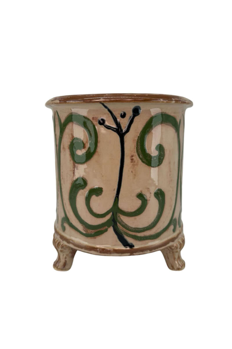 Ovaler Topf aus Keramik mit einem geschwungenen Muster in Grün. Ein handbemalter Topf auf Fuß. Sollte nur von Hand gespült werden, H16xL26xT13.5cm.