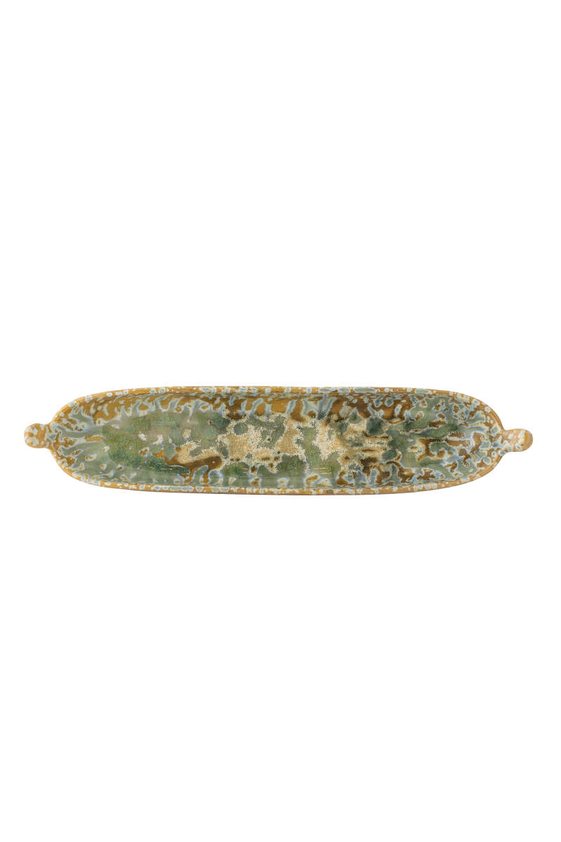 Artikelnummer: 54747Die Servierplatte Lemon von Bloomingville ist länglich und aus Steinzeug mit einer lebendigen, reaktiven Glasur in Grün- und Goldtönen hergestellt. Die längliche Form ist ideal zum Servieren von Brot, Tapas oder kleinen Gerichten. Durch die Beschaffenheit der Glasur kann es zu Farbabweichungen kommen, die jedes Tablett zu einem Unikat machen. L34xH5xW7,5 cm, Spülmaschinen geeignet.