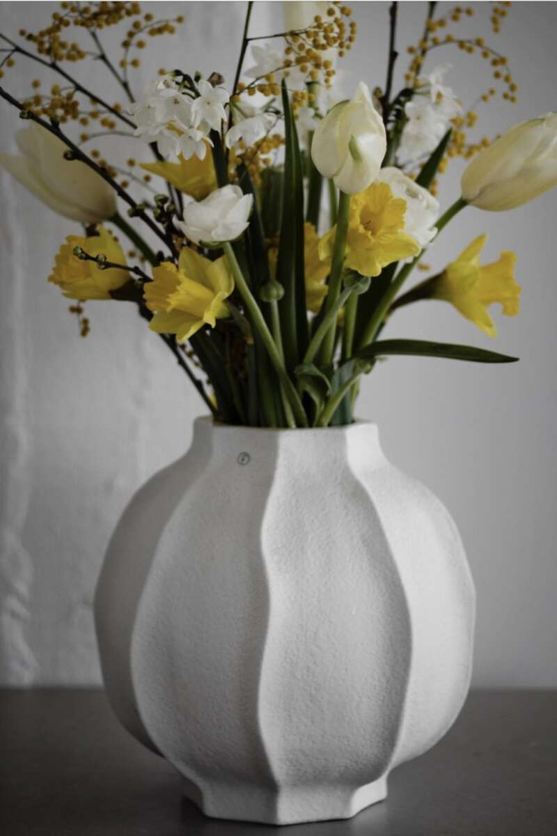 Schale aus Steingut, in Naturweiss, Höhe 5 cm, ø12.3 cm. Eine Schale, die mit ihren feinen Details in Form skulpturaler Linien einen einzigartigen Akzent setzt.