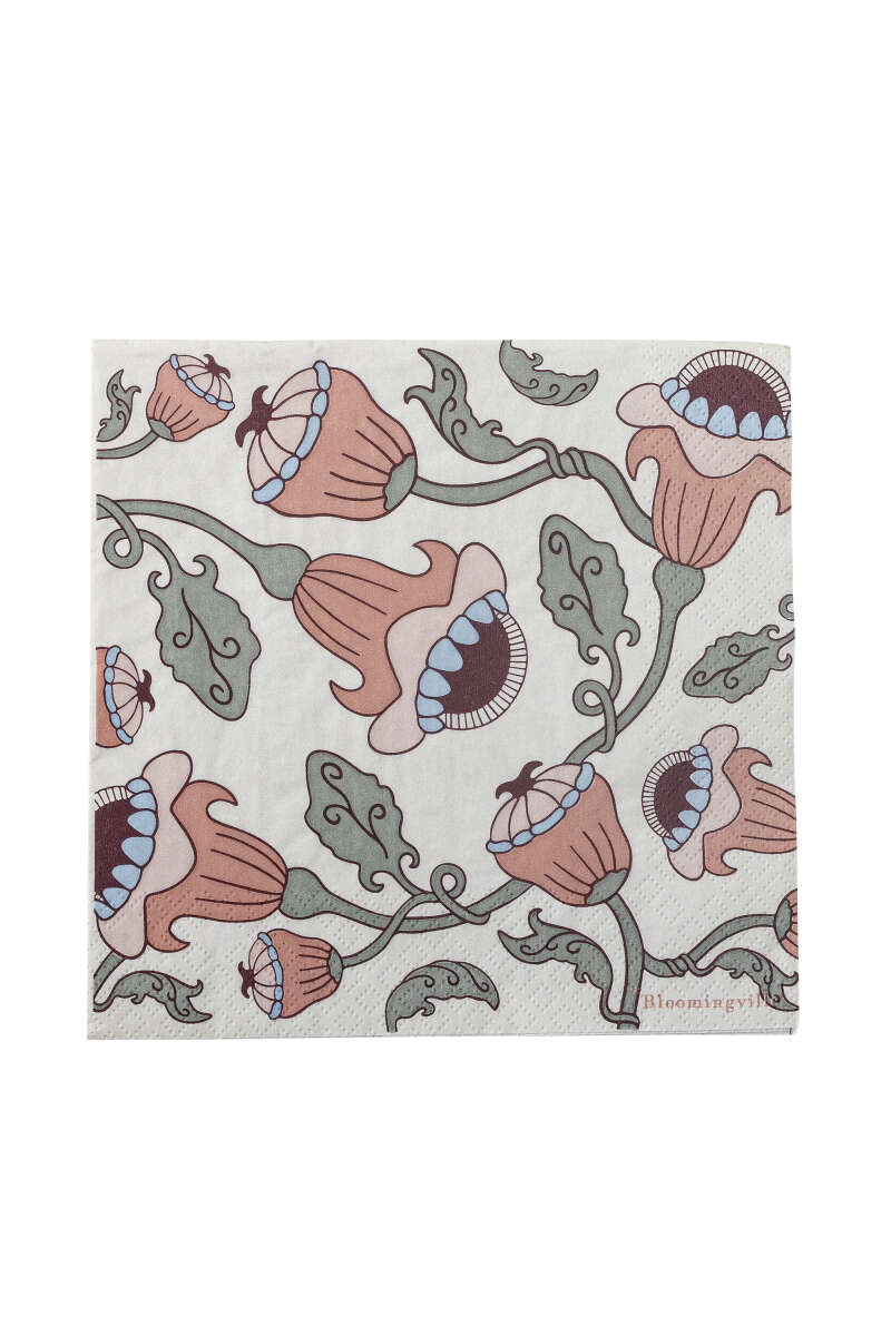 Papier, 20 Stück, 3-lagig, L:33 cm B:33 cm. Die Fazila Serviette von Bloomingville ist ein Paket mit 20 Servietten aus FSC-zertifiziertem Papier. Die Servietten haben ein schönes Blumenmuster in Rosatönen und graugrünen Zweigen, das einen Hauch von Farbe und Eleganz verleiht. Perfekt, um den Alltag aufzupeppen oder für eine festliche Tischdekoration.