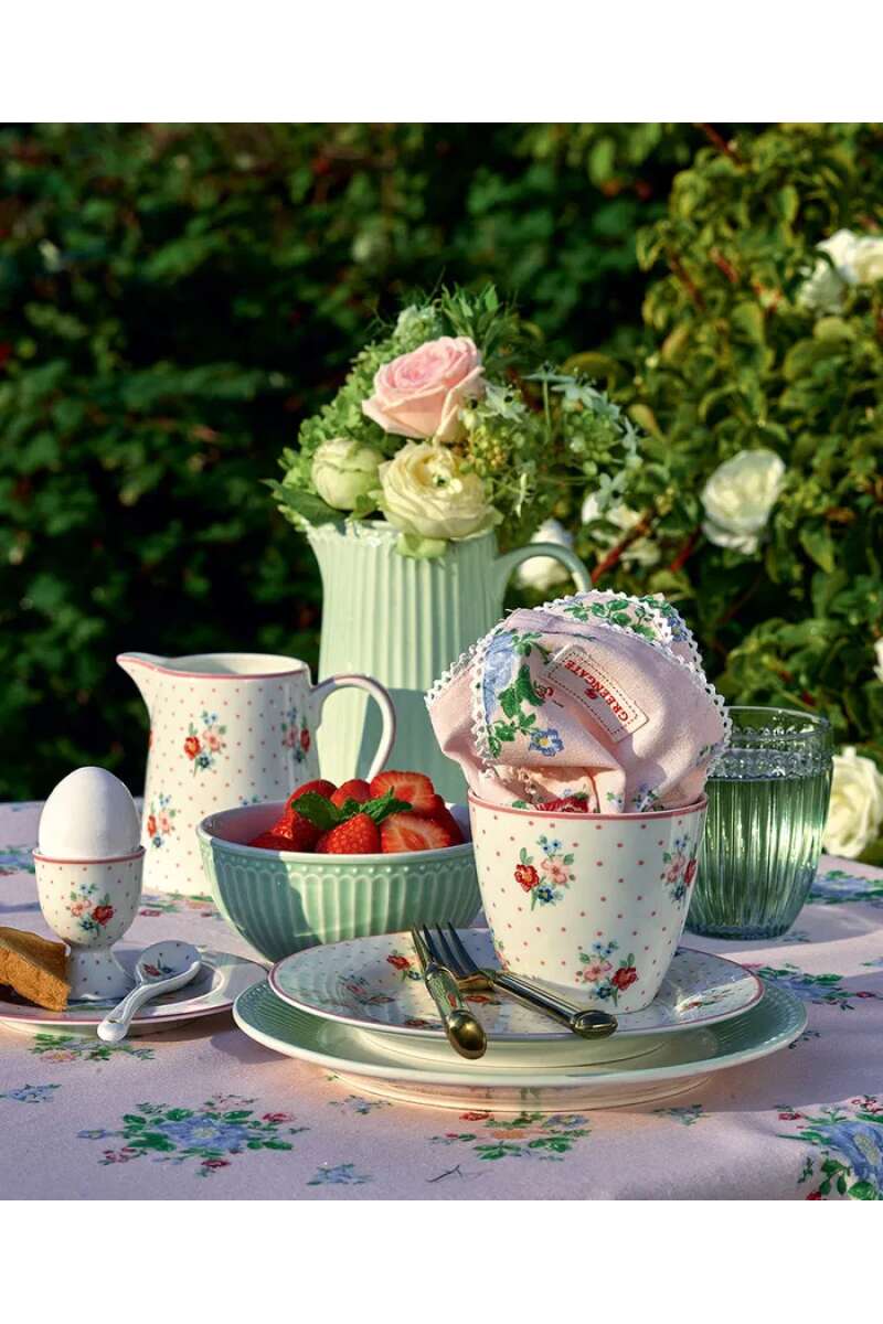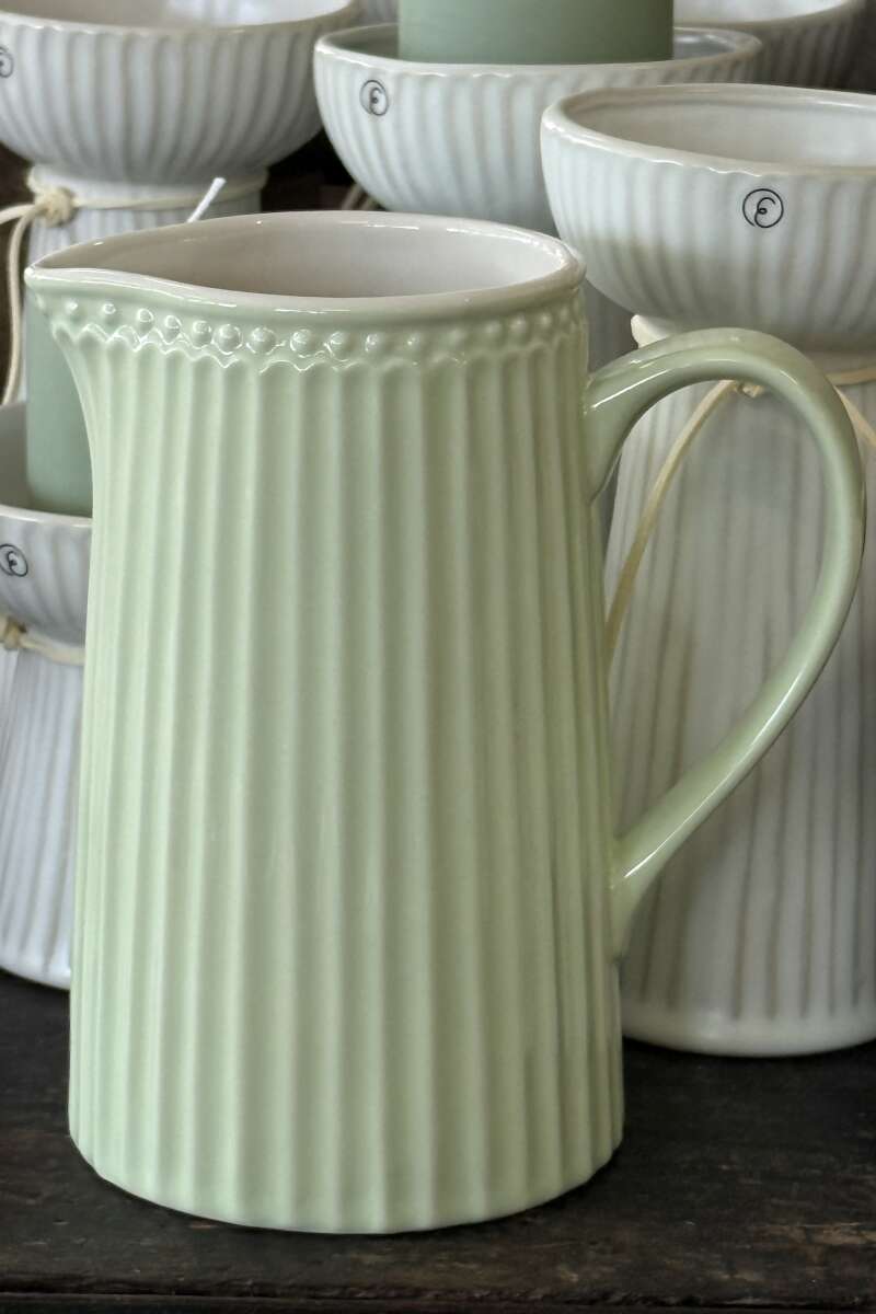 Krug Alice, 1 Liter, Höhe ca. 17,5 cm, Durchmesser ca. 10,5 cm, Breite mit Henkel und Ausgiesser ca. 16 cm. Aus Steingut, spülmaschinenfest, geeignet für Mikrowelle, nicht geeignet für Backofen.