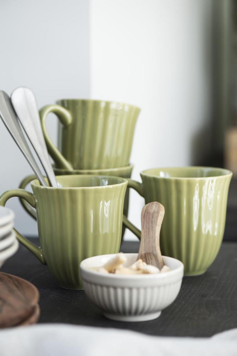 Becher mit Rillen Mynte Herbal Green aus Steingut, H: 10cm / Ø: 9,5cm. Geeignet für Spülmaschine und Mikrowelle. Von LB Laursen.