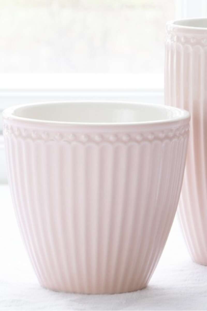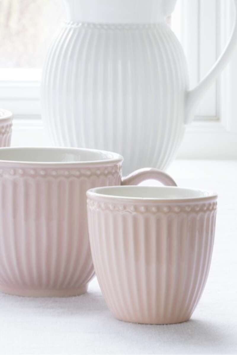 Artikelnummer: 51579Tasse mit Henkel, Alice, Füllmenge ca. 350ml, Höhe 10 cm, Durchmesser 9 cm. Aus Steingut, Spülmaschinenfest, geeignet für Mikrowelle, nicht geeignet für Backofen. Von Greengate.