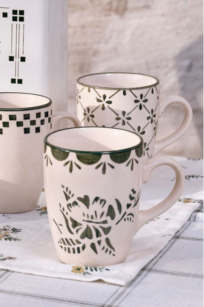 Artikelnummer: 52160Henkelbecher aus Steinzeug mit nostalgischem Blumenmotiv und dekorativer Bordüre,Ø 8 x H 10 cm. Das Muster der Marion-Serie erinnert an die französische Landschaft. Schön zu kombinieren und mit den anderen Motiven zu mixen, ca. 25cl Spülmaschinen- und Mikrowellen geeignet.