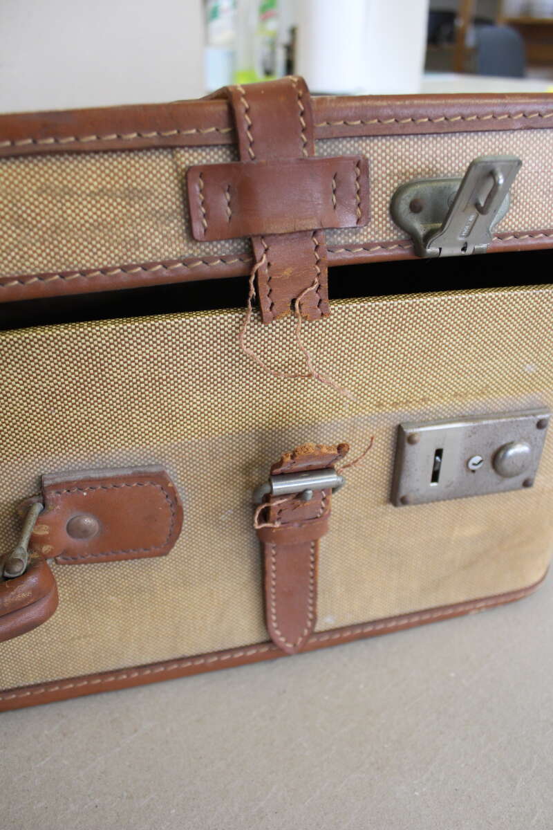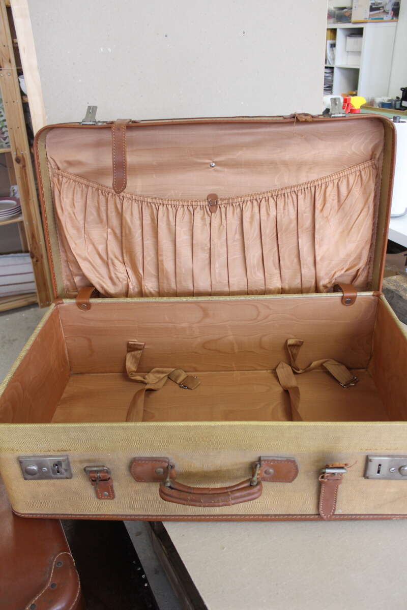 Artikelnummer: 54251Alter Koffer, Höhe ca. 22 cm, Breite ca. 70 cm, Tiefe ca. 40 cm. Der Koffer weist altersbedingte Gebrauchsspuren, Abnutzungen etc. auf. Ein Sicherungsgurt und eine Halterung sind gerissen (siehe Foto). Ein Koffer mit Geschichte.