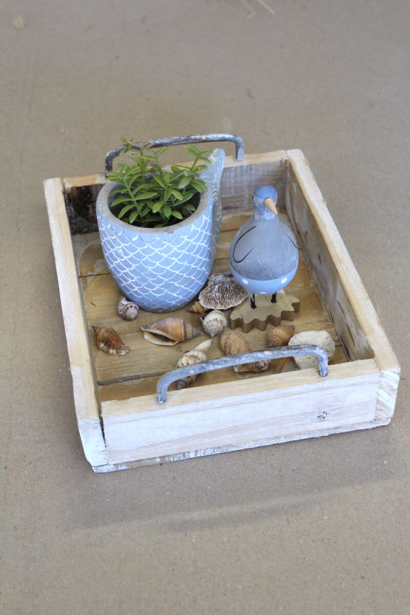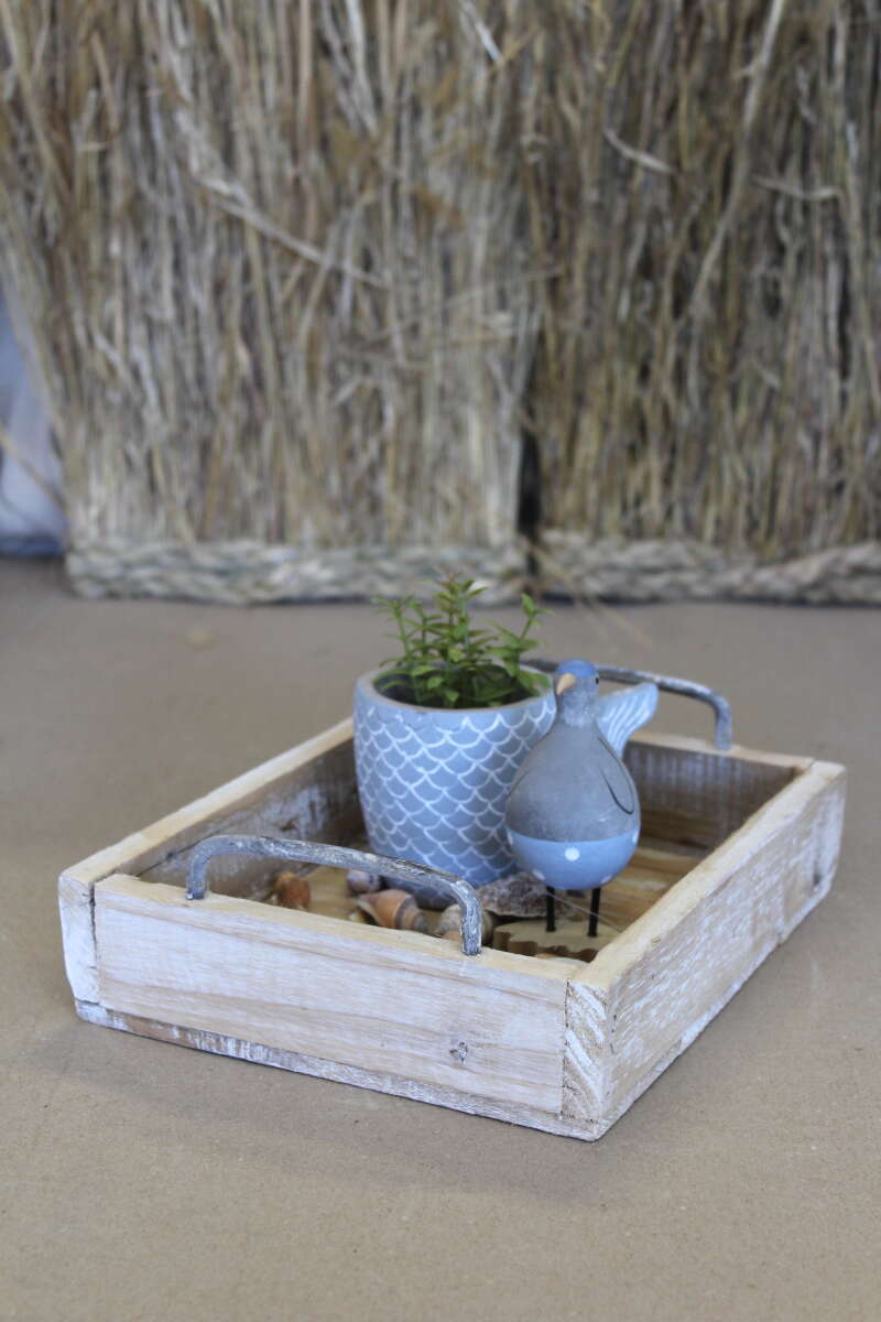 Tablett Bloom aus Holz mit Metallgriffen, das Tablett ist bewusst einfach verarbeitet, es kann Spalten, Splinten und Flickstellen haben,25x20x8 cm. {ohne Deko)
