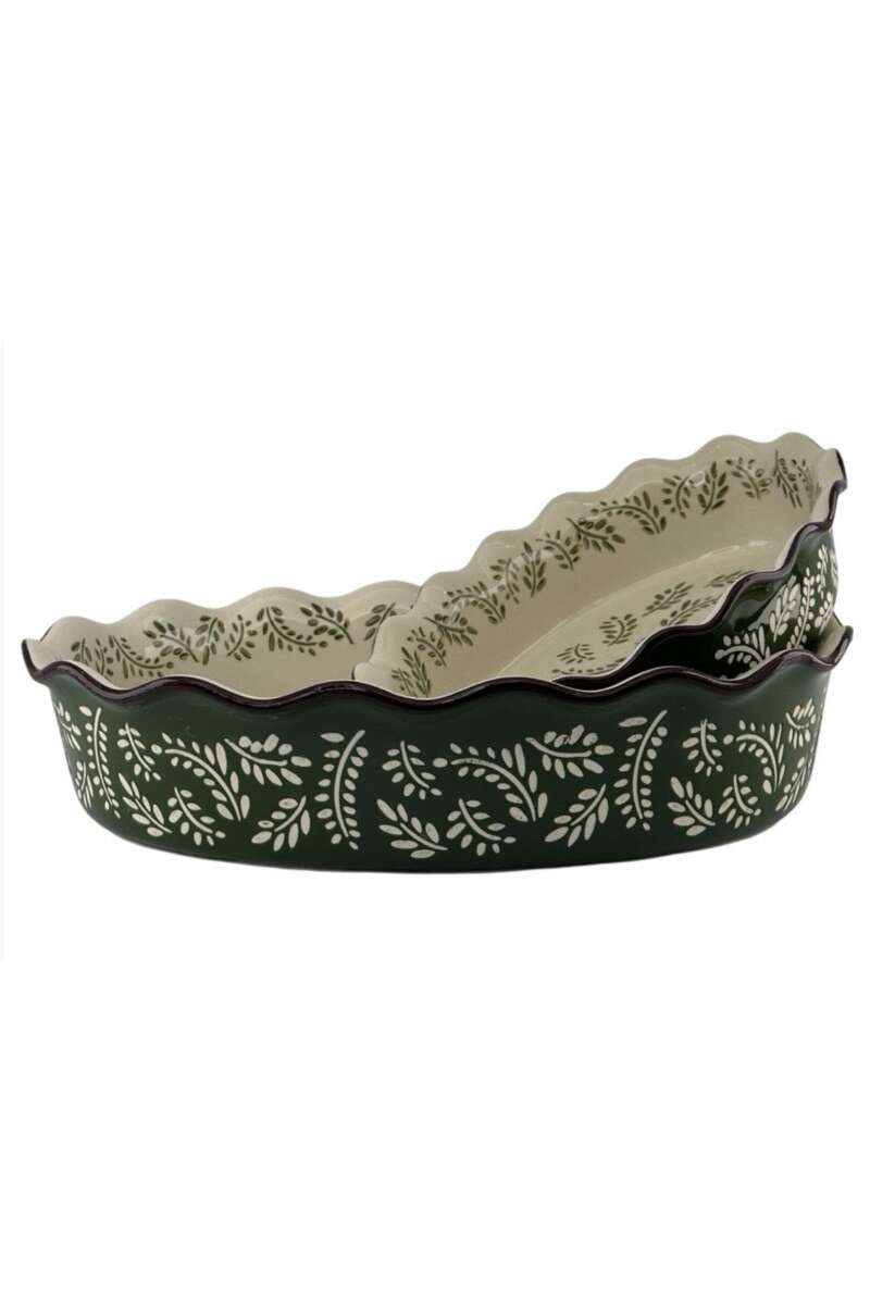 Auflaufform in rustikalem grünen Design mit schönem Blattmuster. Ideal zum Kochen und Servieren. Bringt eine gemütliche Atmosphäre auf den Tisch. Das Muster ist handgedruckt, daher kann das Motiv von Stück zu Stück leicht abweichen. Das Geschirr ist spülmaschinen - und mikrowellentauglich, ofenfest, d.h. es ist für die langsame Erwärmung im Backofen geeignet, nicht aber für das Kochen auf offener Flamme. Durchmesser 28cm, Höhe 6.5cm.
