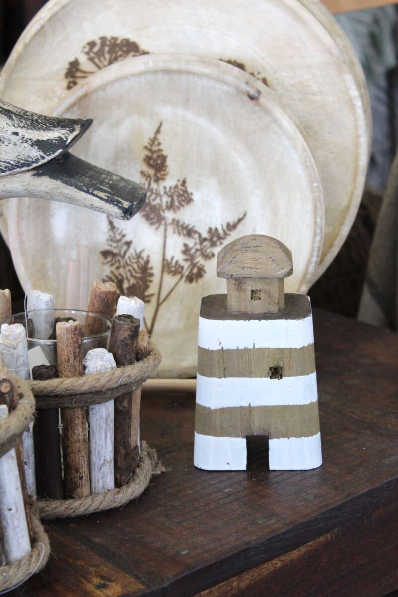 Artikelnummer: 52215Kleiner süsser Leuchtturm aus recyceltem Holz, B: 5 H: 15 L: 8 cm