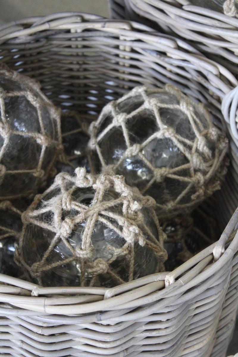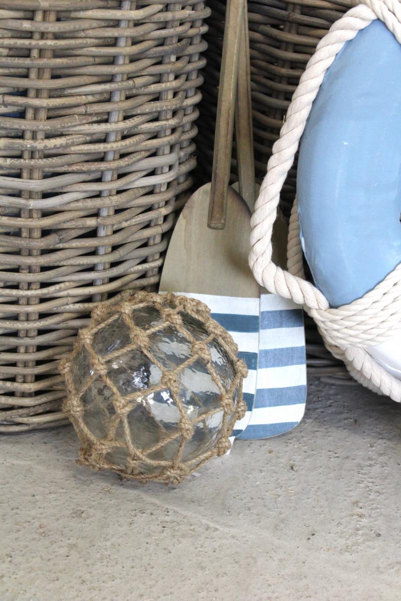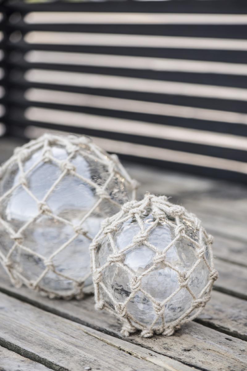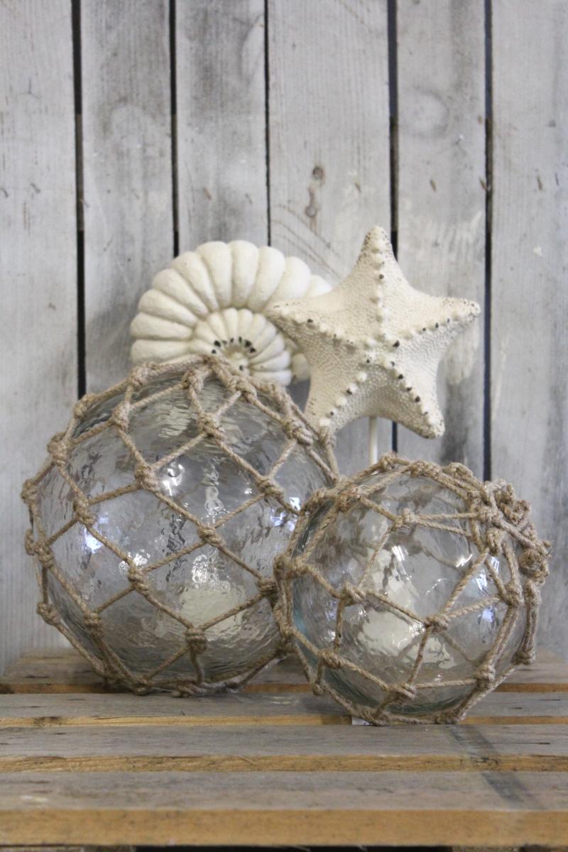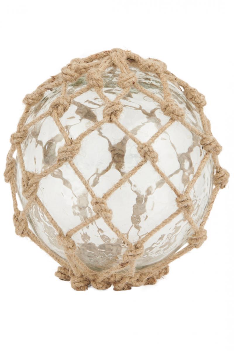 Artikelnummer: 45609Kugel aus Glas mit Jutenetz,alten Fischerkugeln nachempfunden, sie wurden an die Netze gehängt,als es noch kein Plastik gab, ø 16cm, von IB Laursen.
