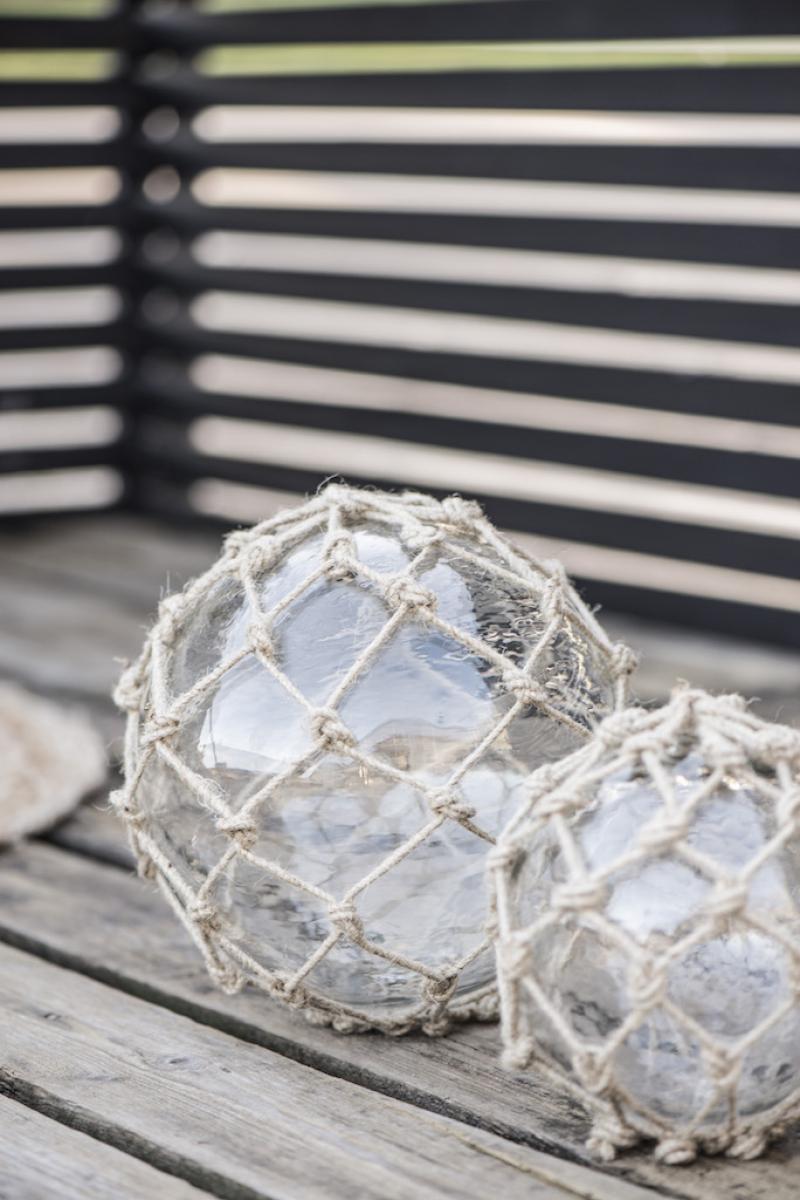 Artikelnummer: 45610Kugel aus Glas mit Jutenetz,alten Fischerkugeln nachempfunden, diese wurden an die Netze gehängt, als es noch keinen Plastik gab, ø 20cm, von IB Laursen.