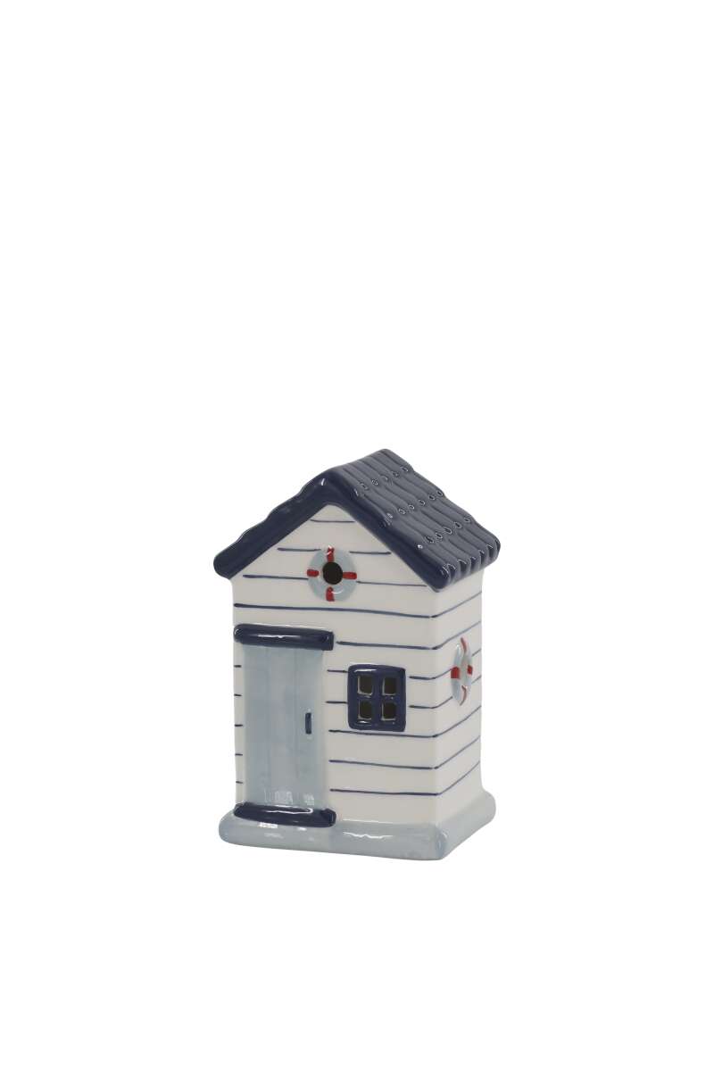 Artikelnummer: 54484Herziges Strandhaus aus Keramik, H15,5/L9,5/B8 cm, Ocean Blue und Weiss. Es ist handbemalt, daher kann es zu Unregelmäßigkeiten in der Glasur kommen.