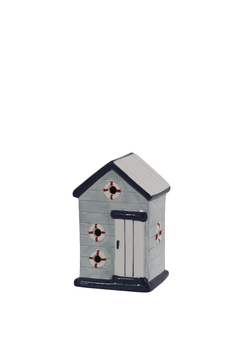Artikelnummer: 54486Herziges Strandhaus aus Keramik, H15,5/L9,5/B8 cm, Sky Blue und Weiss. Es ist handbemalt, daher kann es zu Unregelmäßigkeiten in der Glasur kommen.