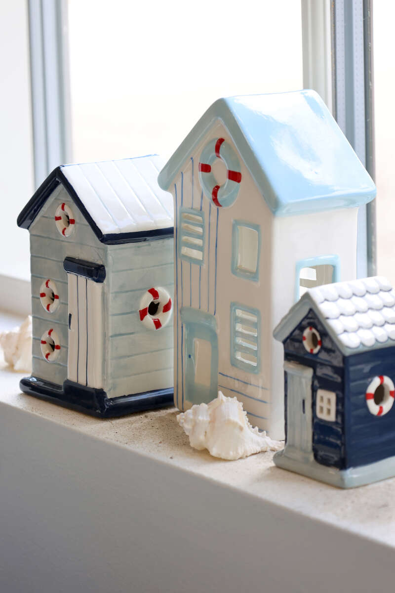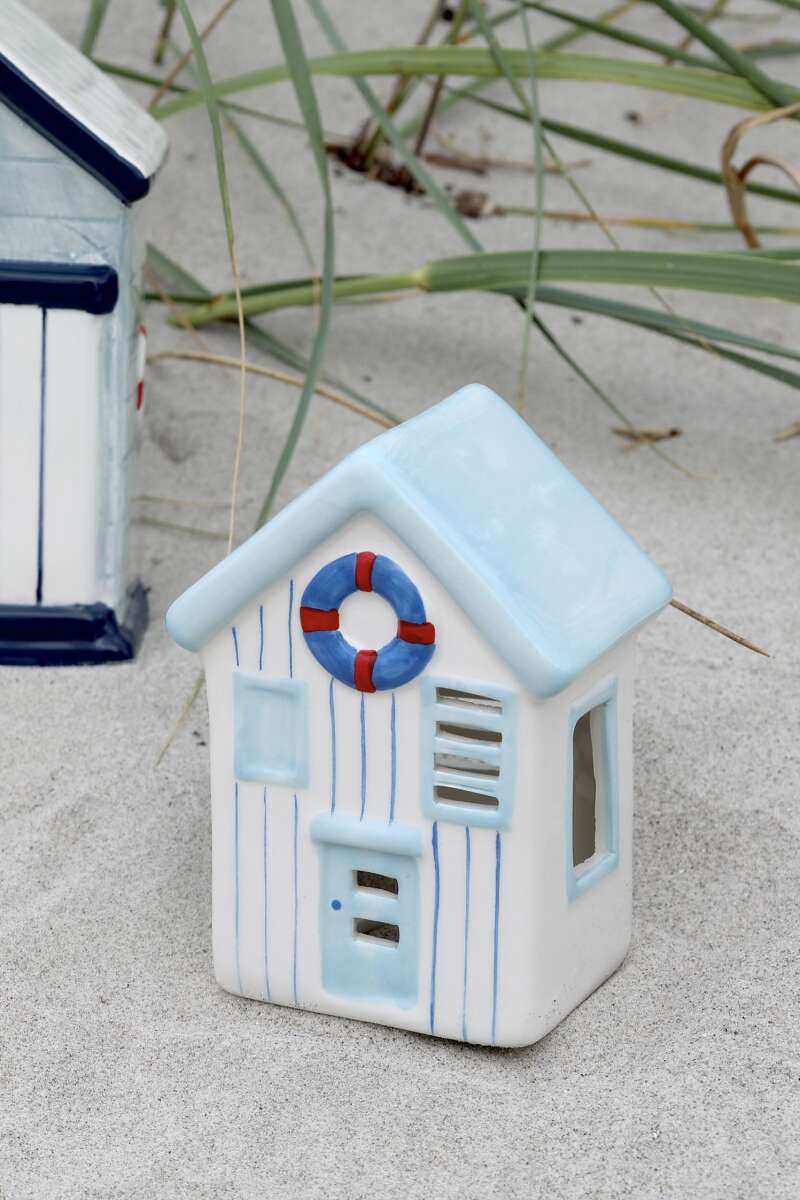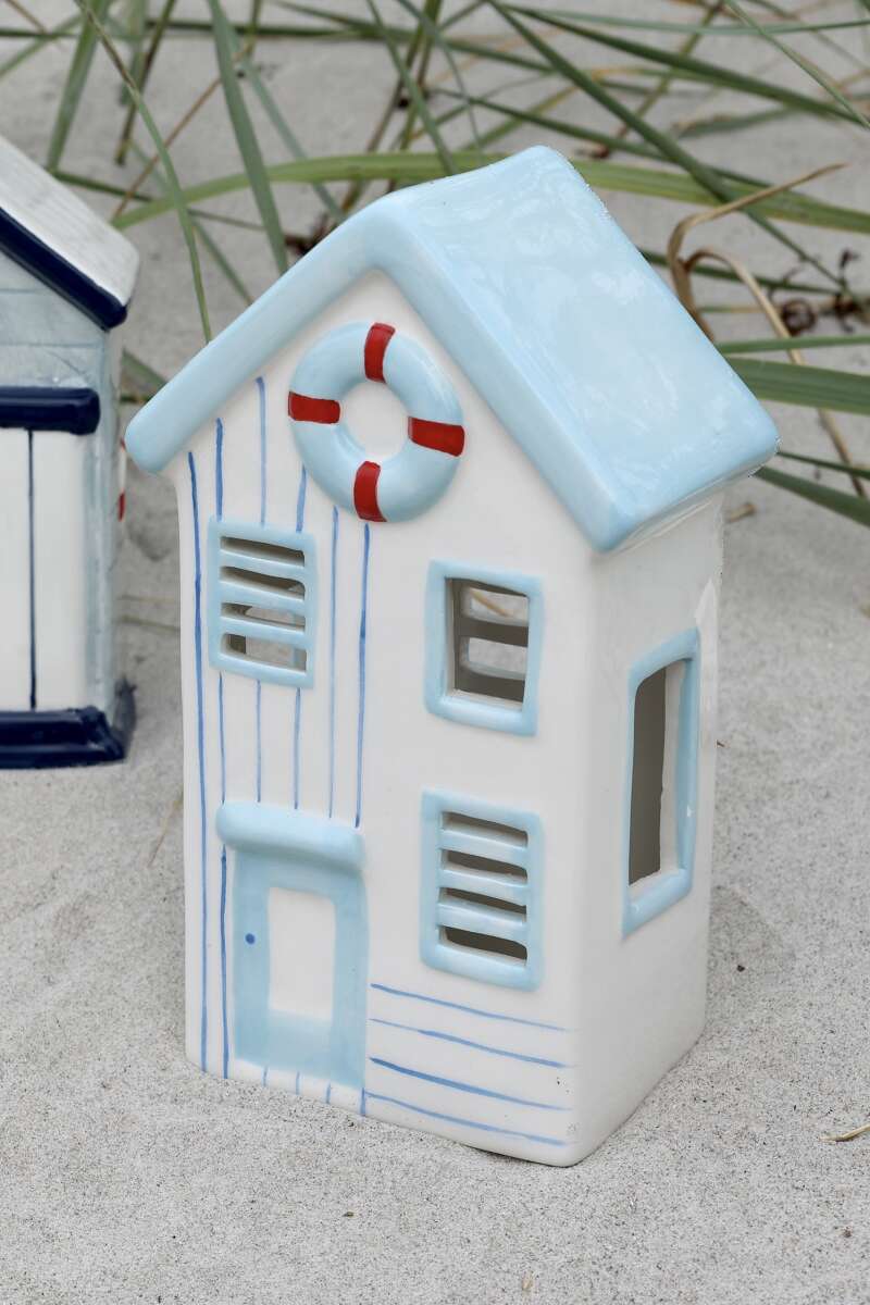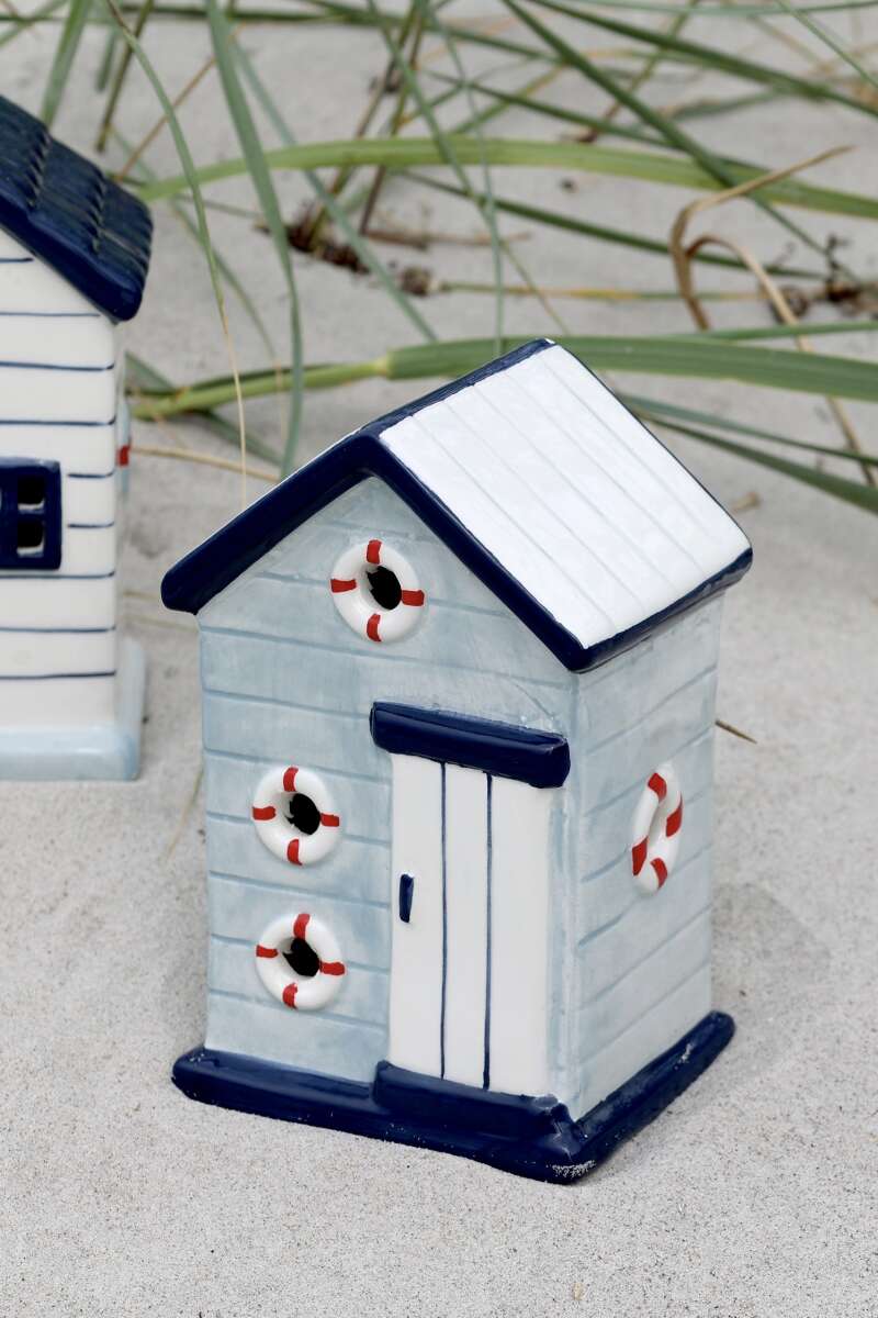Herziges Strandhaus aus Keramik, H10/L6/B6 cm, Ocean Blue und Weiss. Es ist handbemalt, daher kann es zu Unregelmäßigkeiten in der Glasur kommen.
