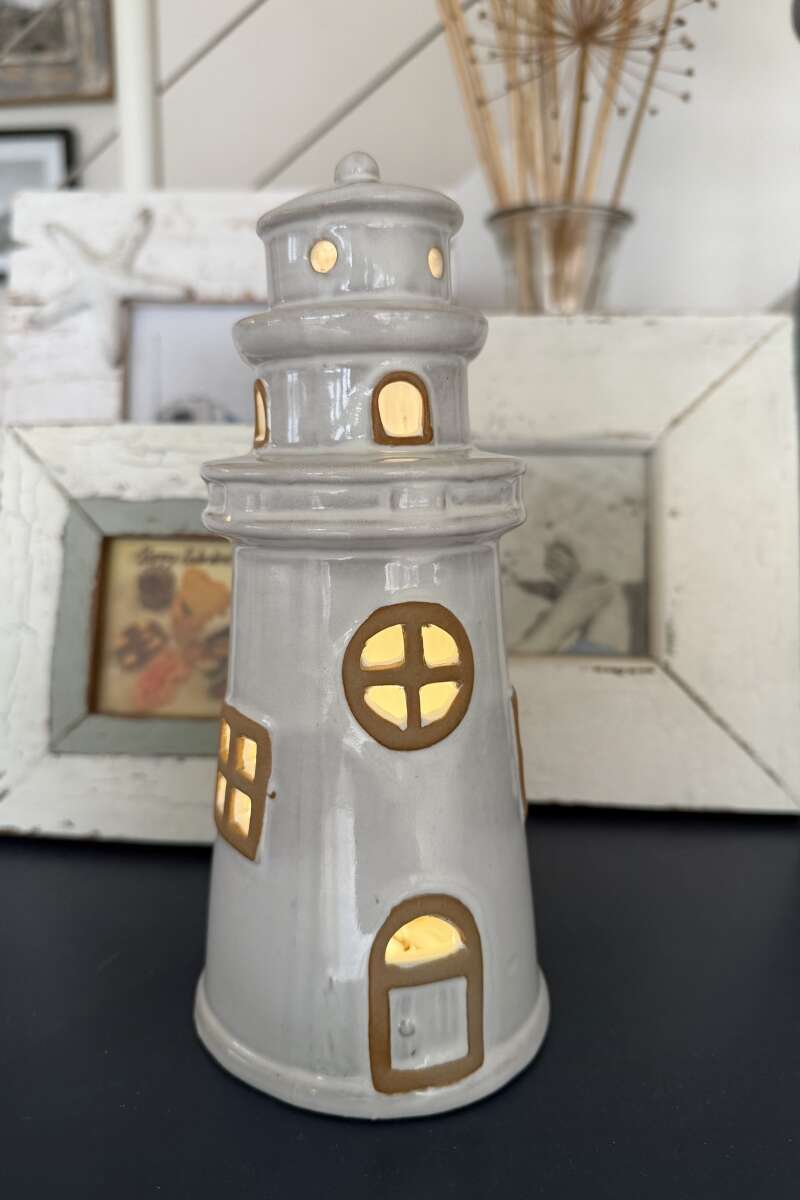 Artikelnummer: 54490Süsser Leuchtturm aus Keramik, H22/D9,5 cm, Creme, mit LED mit An/Aus Schalter, da er handbemalt ist kann es zu Unregelmässigkeiten kommen. (es braucht 2x V13GA/LR44 Batterien, sie sind nicht dabei)(passende Batterien Artikelnummer: -> -> 54651 )