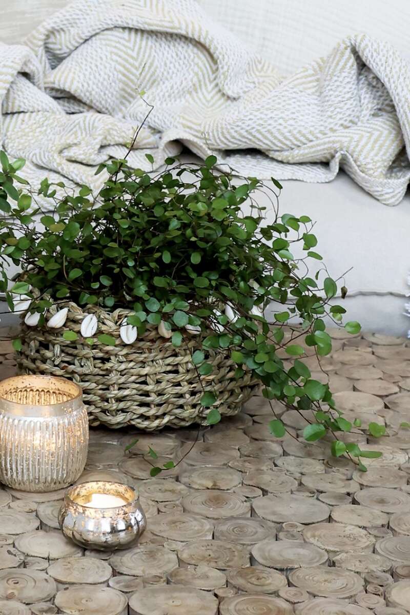 Artikelnummer: 54177Korb aus geflochtenem Gras, mit Muscheln, H10/D18 cm natur.
