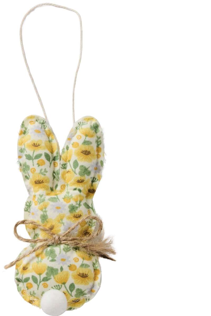Artikelnummer: 5451654516: Stoffhäsli mit Pommelchen gelbe Blumen H10.5cmSüsser Hasi mit Pommel, aus Baumwolle mit Polyesterfüllung, B: 1,5 H: 10,5 L: 5cm an Juteschnur