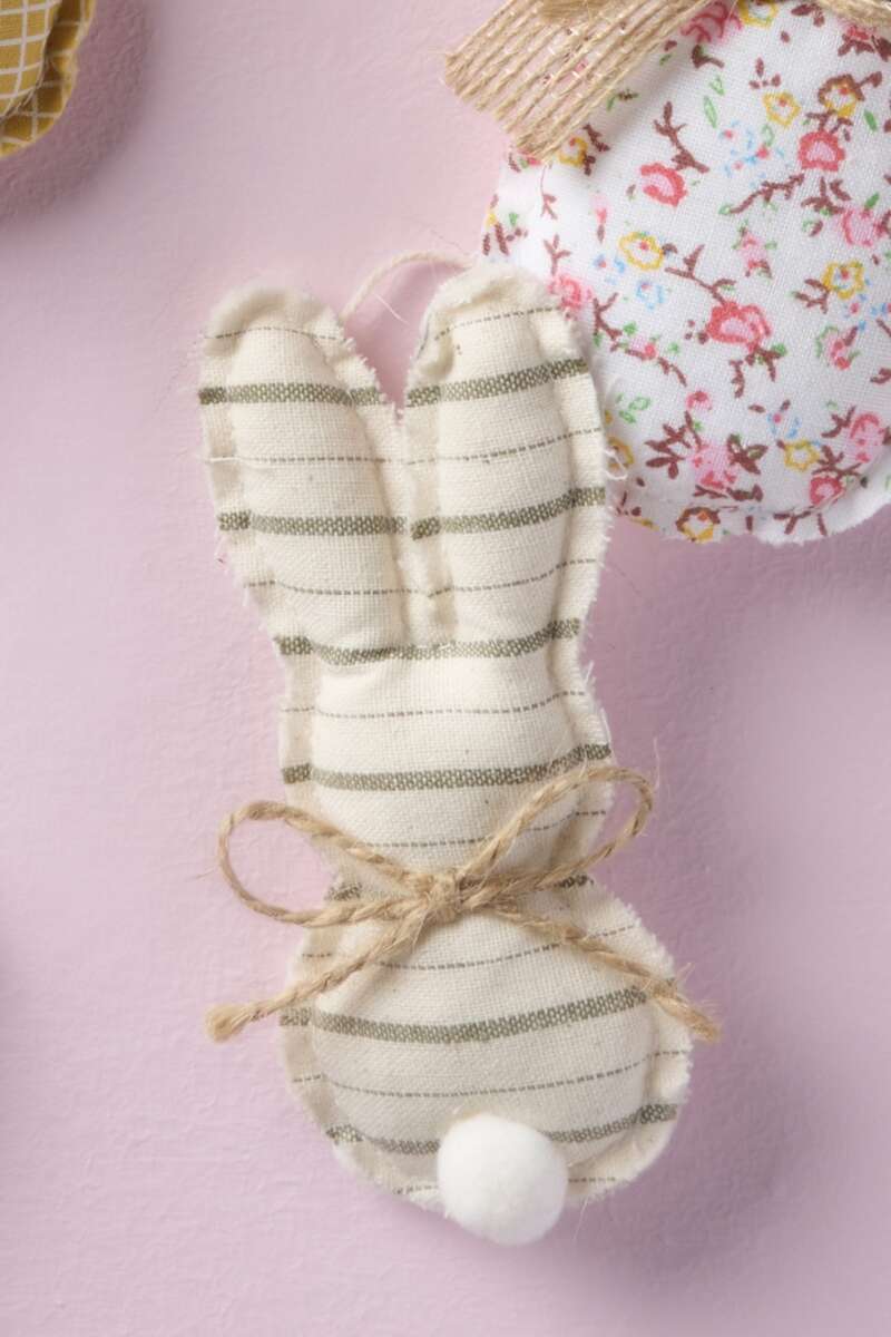 Artikelnummer: 5451754517: Stoffhäsli mit Pommelchen Herzli H10.5cmSüsser Hasi mit Pommel, aus Baumwolle mit Polyesterfüllung, B: 1,5 H: 10,5 L: 5cm an Juteschnur