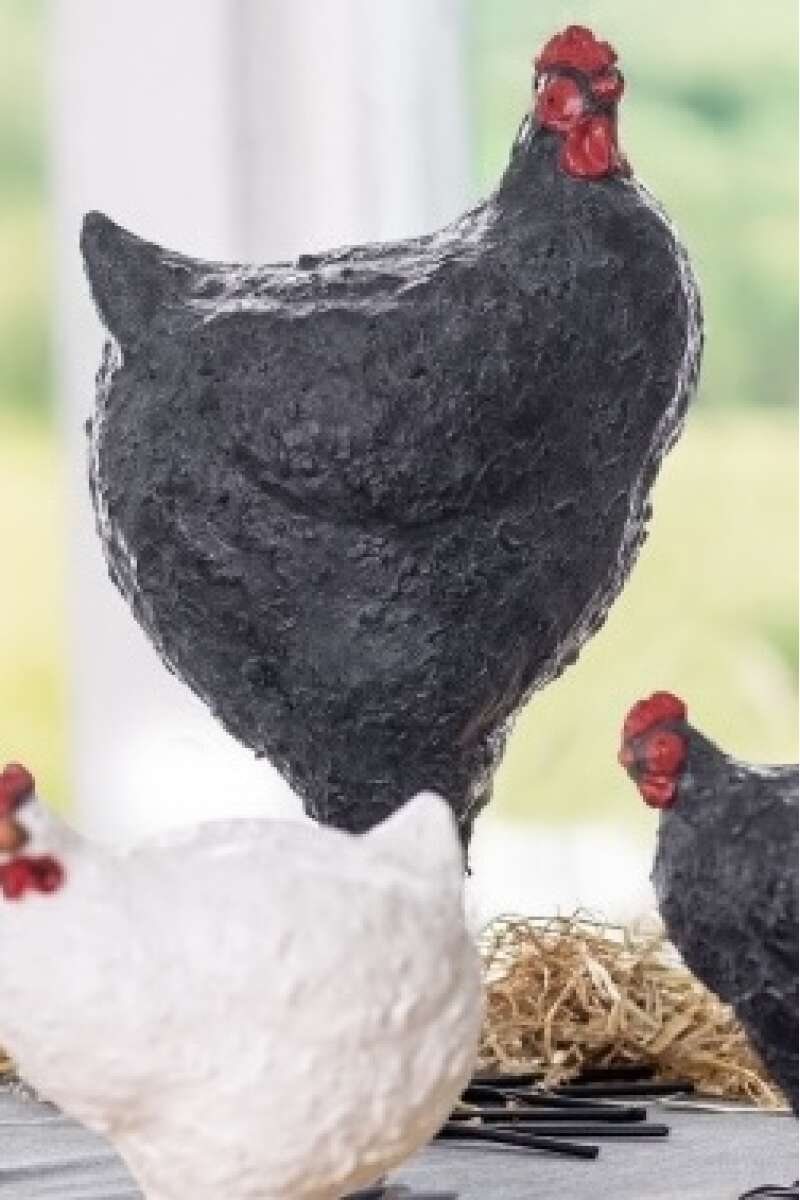 Artikelnummer: 54604Dekoratives Huhn aus Polyresin, auf Metallfüssen, H43cm