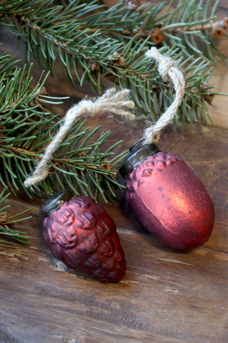 Stilvolle rote Weihnachtskugel aus Glas im Landhausstil, mit Vintage-Look. Größe ø3.5cm.