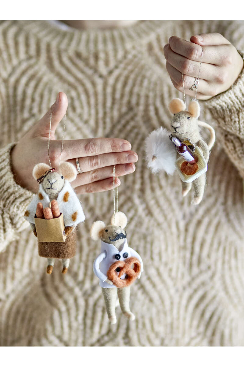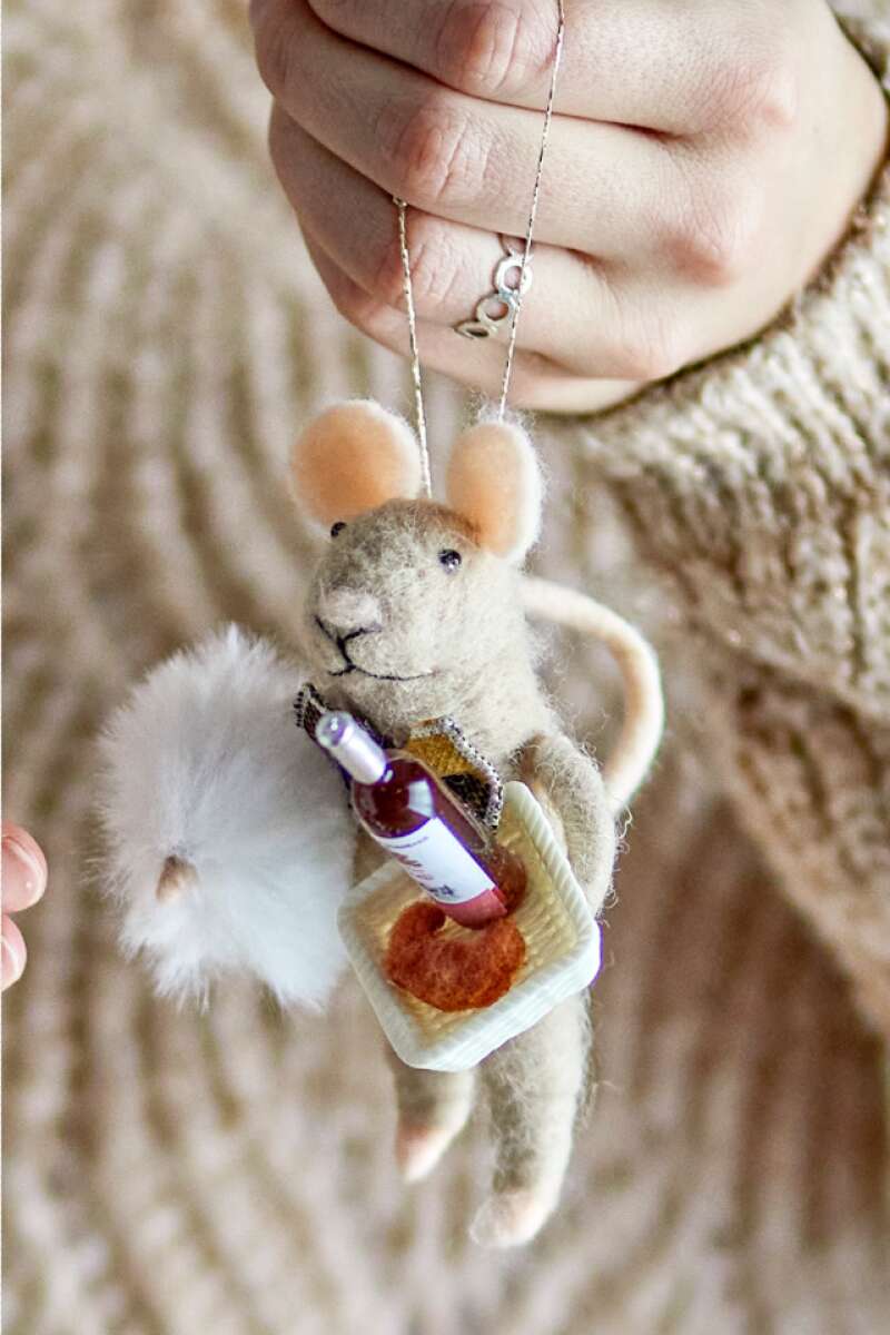 Bezaubernde Maus aus gefilzter Wolle gefertigt und mit entzückenden Details versehen, die ihre Geschichte zum Leben erwecken. Im niedlichen Outfit gekleidet, verleiht diese Maus Ihren Weihnachtsdekorationen eine süße Note. Ausgestattet mit goldenen Aufhängeschnüren, lässt sie sich leicht am Weihnachtsbaum anbringen oder in ein größeres festliches Arrangement integrieren. L6xH12xW7 cm.