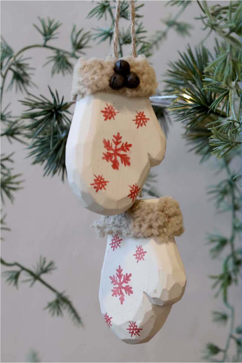 Artikelnummer: 54285Handschuhe aus Lindenholz, Polyesterfell und Jute, H7/L5/B2 cm, in antique Creme mit roten Schneeflocken, Handarbeit