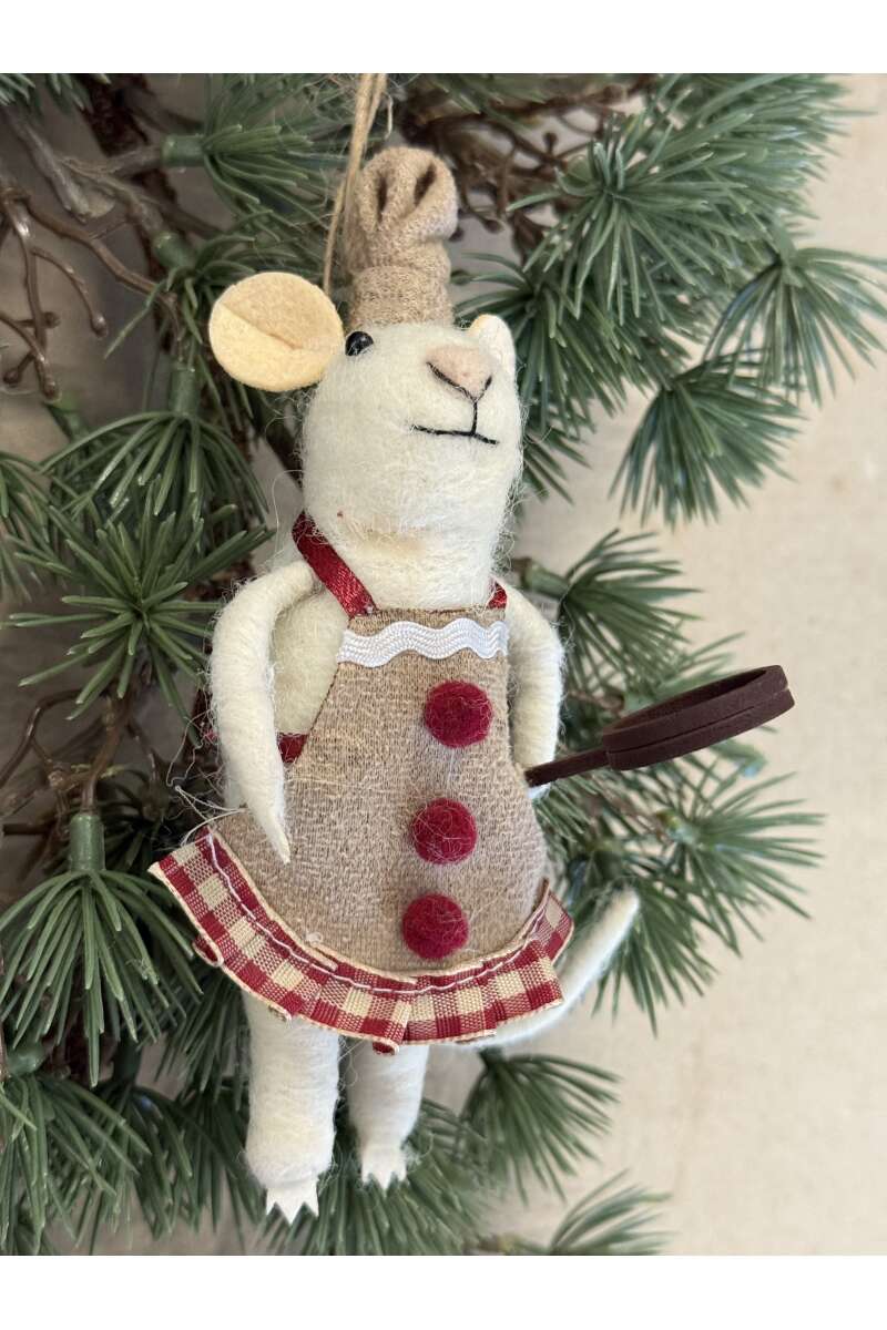 Artikelnummer: 54341Charmantes Mäuschen, gefilzt aus Wolle und mit süssen Details verziert. Ihr spielerisches Outfit trägt zu einer gemütlichen Atmosphäre in Ihrer Weihnachtsdekoration bei. Ausgestattet mit einer Aufhängeschnur, lässt sie sich leicht am Weihnachtsbaum platzieren oder als Teil einer größeren Dekoration, wo sie eine lustige Dimension hinzufügt. L10xH13xW5 cm.