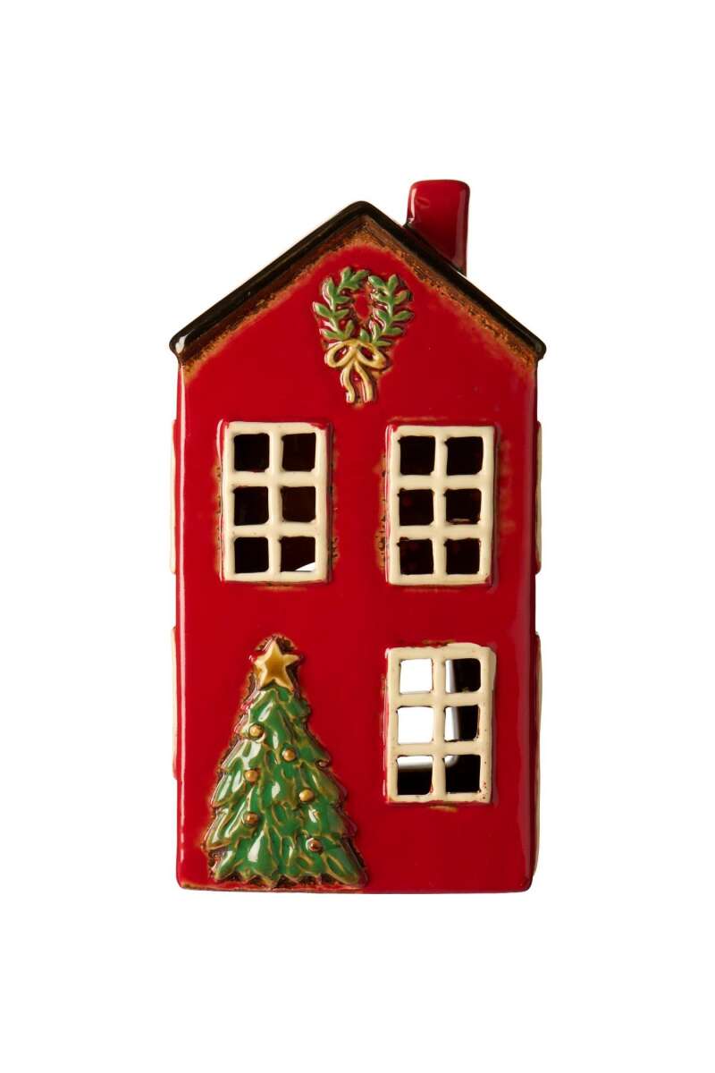 Keramikhaus für Teelicht, B: 7,3 H: 20 L: 10,4cm. Schaffen Sie die perfekte Weihnachtsstimmung mit diesem wunderschönen roten Keramikhaus, das mit einem Tannenbaum vor dem Haus dekoriert ist. Setzen Sie ein Teelicht oder eine Lichterkette hinein, damit Licht aus den kleinen Fenstern strahlen kann. Das Haus ist Teil der Serie von Keramikhäusern von Ib Laursen, die in einer großen Auswahl an Größen, Farben und Designs angeboten wird. Perfekt für diejenigen, die eine persönliche Sammlung erstellen möchten.