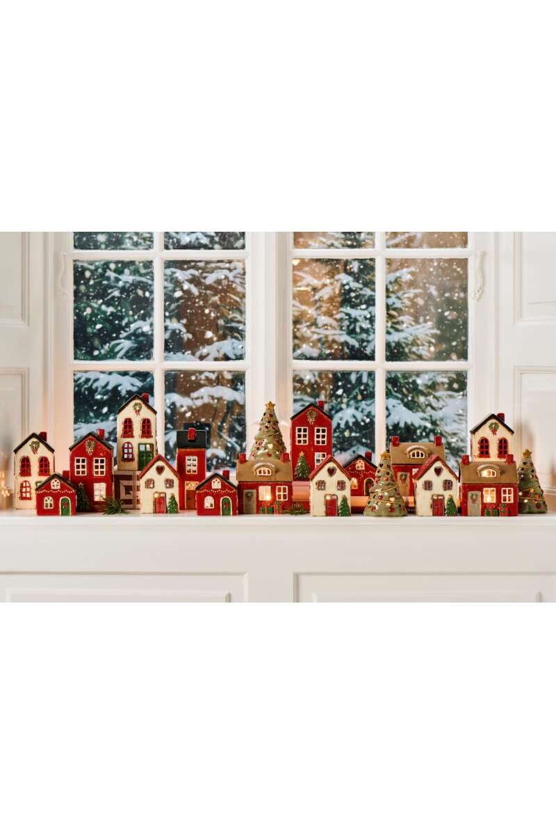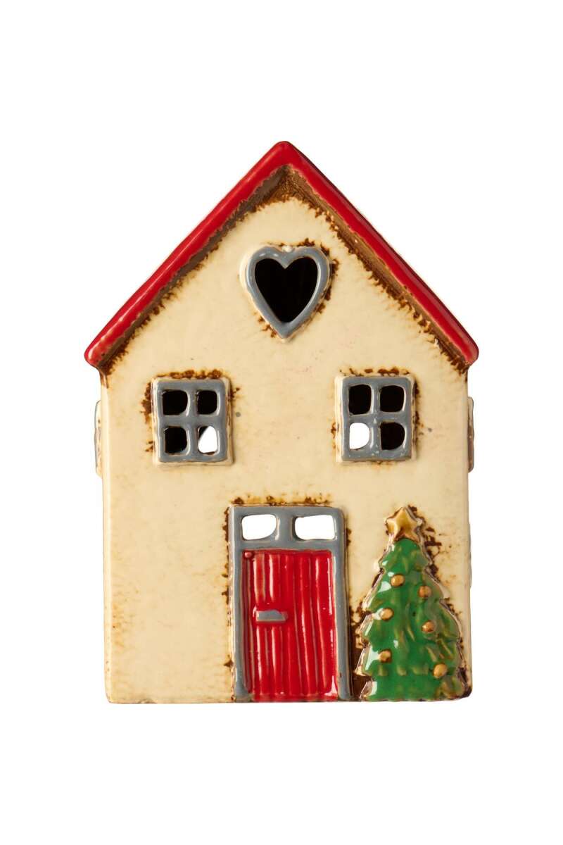 Keramikhaus mit Tannenbaum und roter Tür H14cm