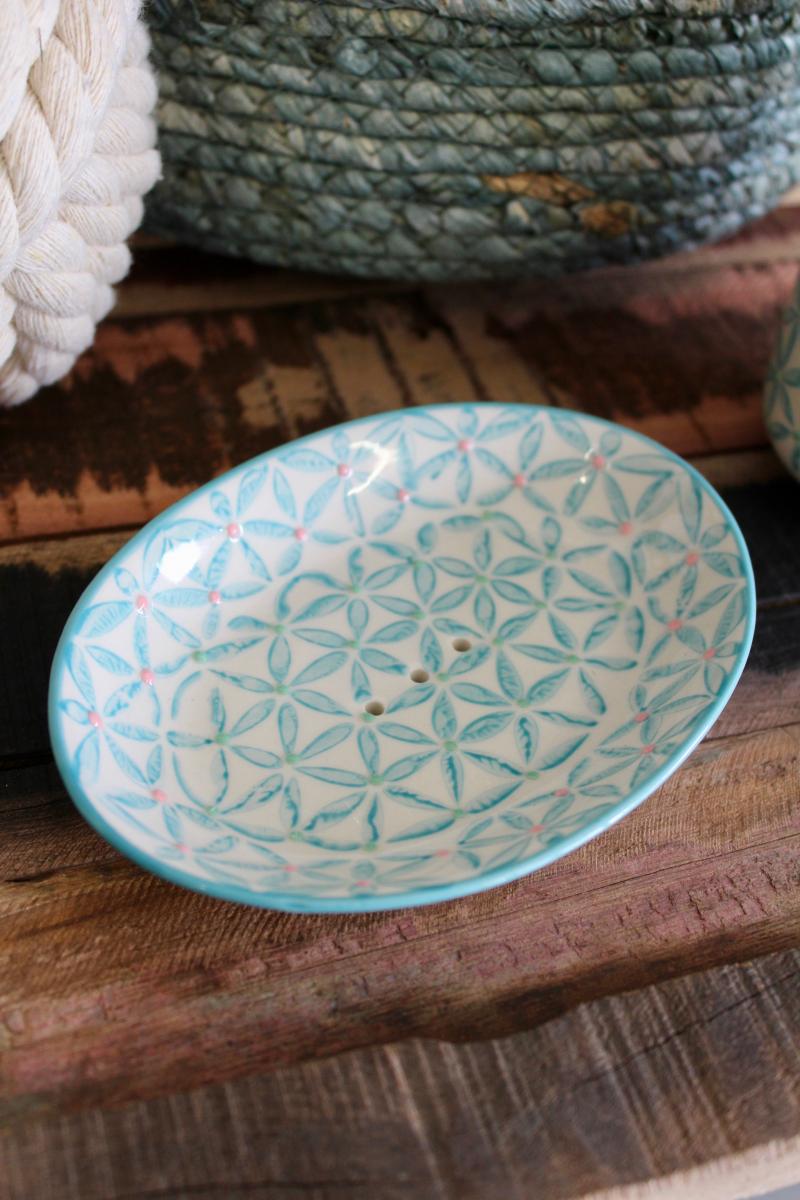 Artikelnummer: 50262Schale aus handbemalter Keramik, mit Löchern für den Wasserablauf - damit die Seife immer trocken liegt - 14 x 9,5 x 2 cm von Tranquillo.