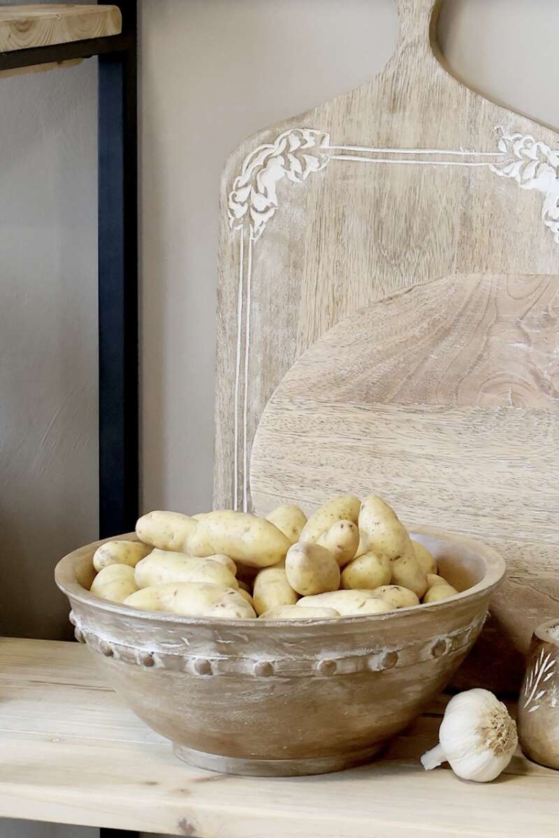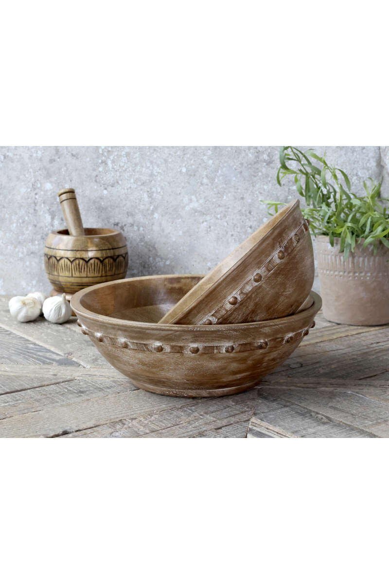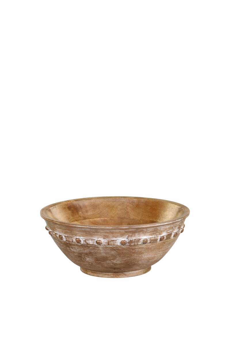 Klassische Holzschüssel aus Mangoholz, H8/D25 cm, natur. Die lebensmittelechte Schale kann 2 Liter fassen und sieht auf dem Esstisch, als Obstschale oder Brotkorb wunderschön aus. Sie ist mit einfachen, aber schönen Details verziert, die zu ihrem Charme und ihrer Wärme beitragen. Von Hand spülen. Sie ist auch in einer größeren Größe erhältlich.