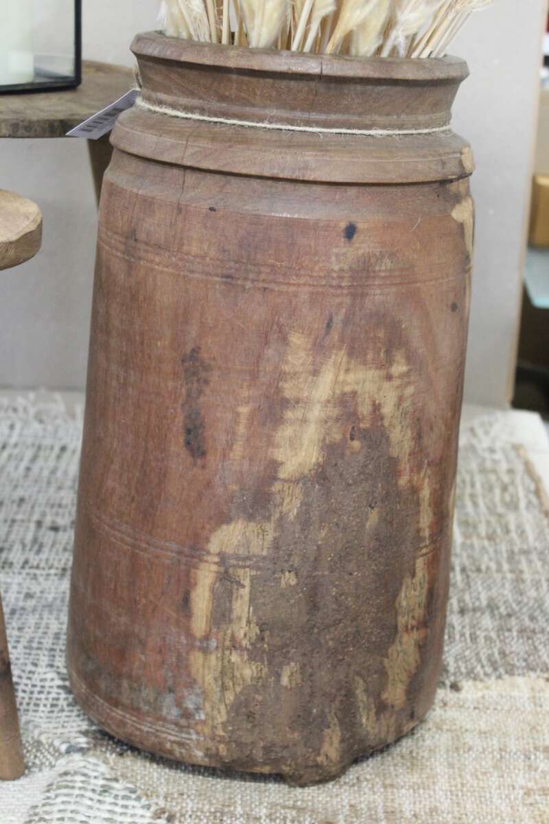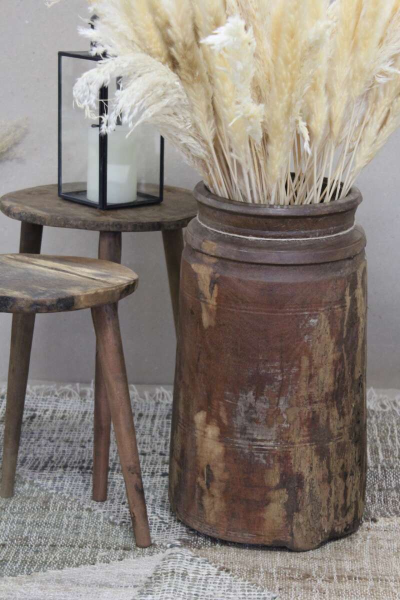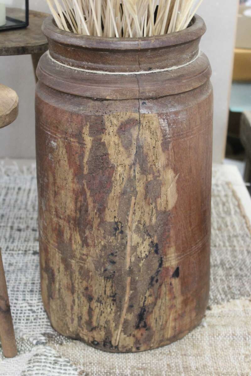 Artikelnummer: 54397Wunderbar schwere Vase aus Altholz, mit Rillen. Das Holz hat Risse, Holzwurmlöcher und ist auch abenteuerlich repariert, was sie einzigartig uns charmant macht, Höhe 44cm, ø23cm. Auch kann sie etwas schief stehen. Nicht wasserdicht.
