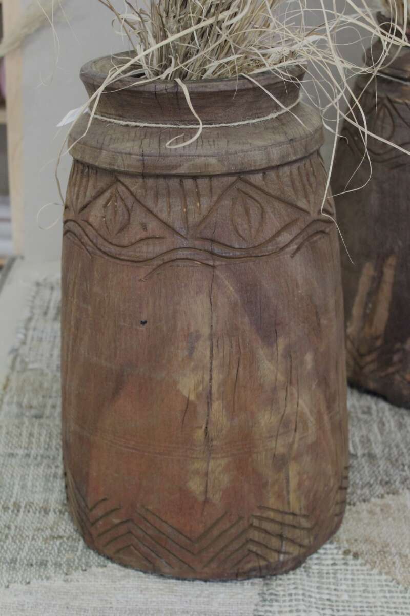 Artikelnummer: 54401Wunderbare schwere aus Altholz, Höhe 48cmx ø30cm, mit Schnitzereien, hat auch mal Risse und Fehler im Holz, was ihr eine Einzigartigkeit und Charme verleiht, nicht wasserdicht. Steht je nach Richtung etwas schief auf den geschnitzten Beinchen.