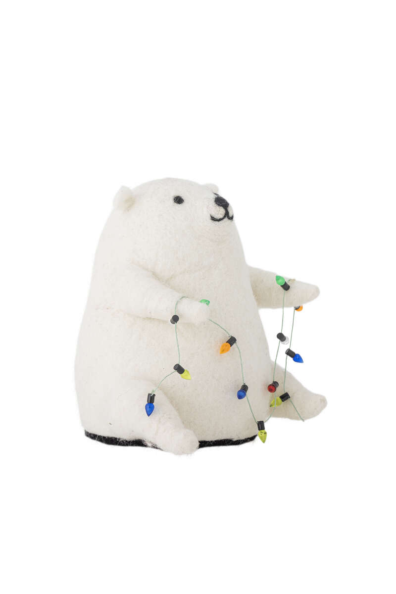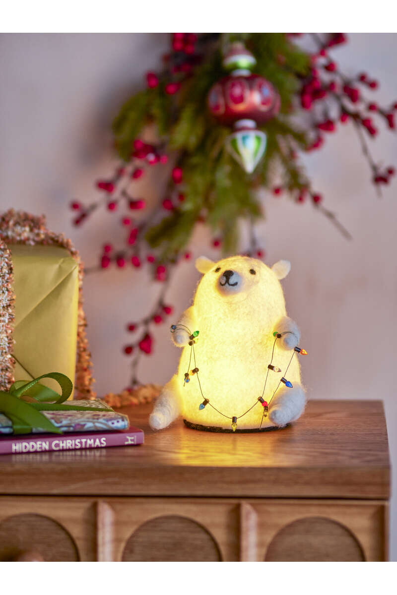 Die Wally Deko mit Licht von Bloomingville ist ein aus Wolle gefilzter Polarbär, der eine bunte Lichterkette in den Armen hält. Dieser entzückende Polarbär leuchtet mit einem warmen, weißen Licht und fügt jeder Umgebung eine gemütliche Atmosphäre hinzu. Perfekt als Teil der Winterdekorationen, auf einem Regal oder auf der Fensterbank, wo er während der kalten Monate Freude und Wärme verbreiten kann. L14xH15xW12 cm. (Braucht 3x AAA Batterie, nicht enthalten)