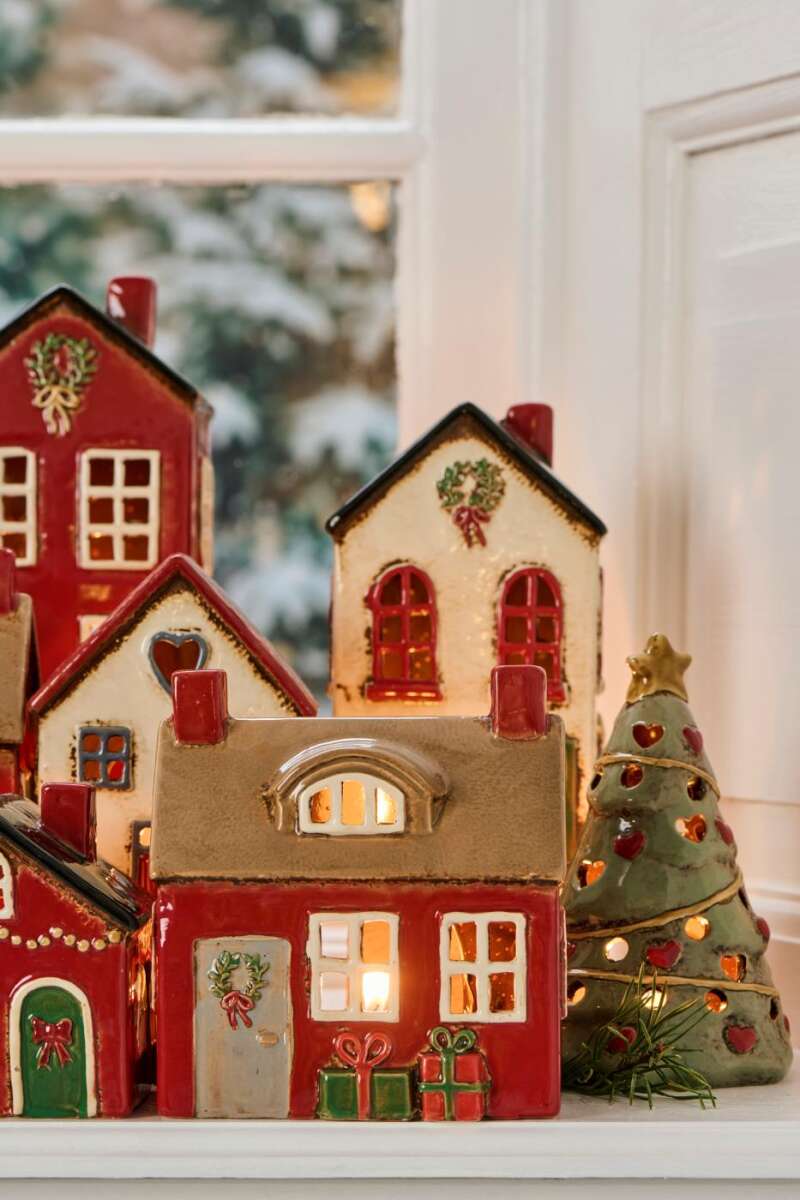 Keramikhaus mit Tannenbaum und roter Tür H14cm