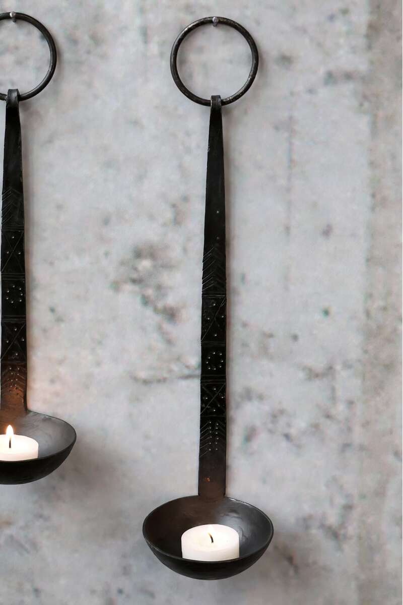 Teelichthalter aus Gusseisen, zum Hängen, H29/D8 cm in antiquem Schwarz.