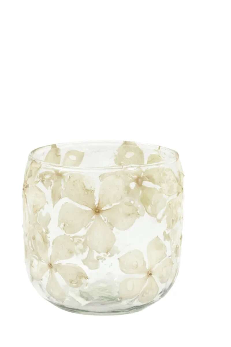 Artikelnummer: 54535Teelicht aus Glas, Trockenblumen sind in das Glas eingegossen und macht es zu einem einzigartigen Kunstwerk, jedes ist daher etwas unterschiedlich, H9xø9cm.