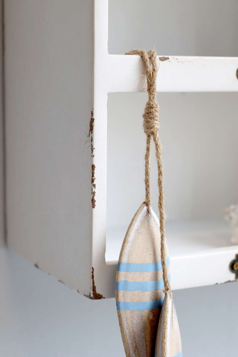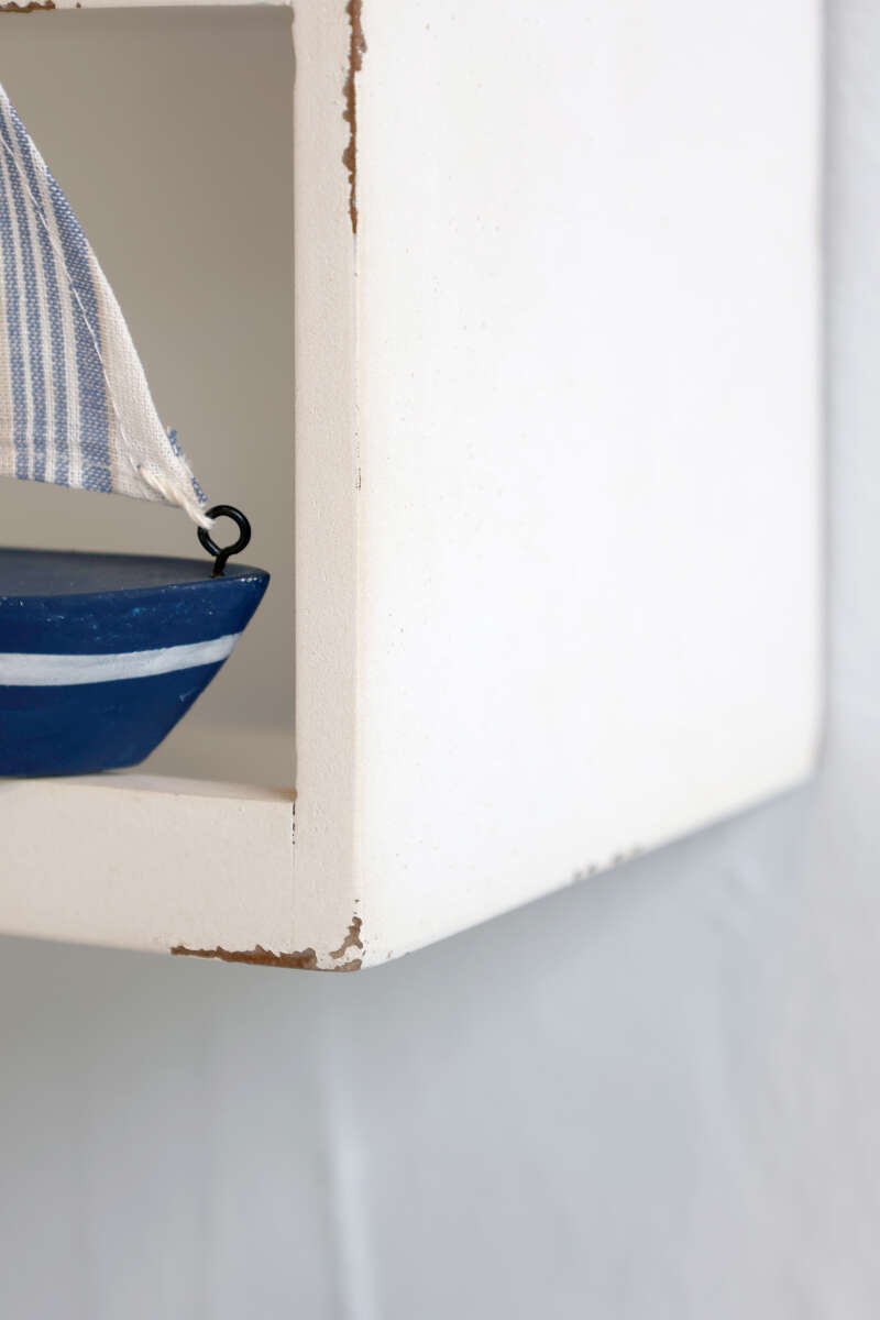 Regal aus Sperrholz, auf alt getrimmt mit abgewetzten Kanten und Ecken, H37/L50/B14,5 cm, antique creme.