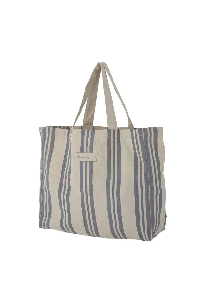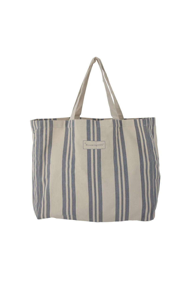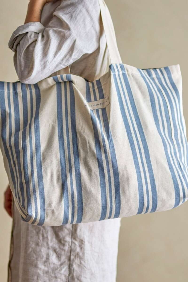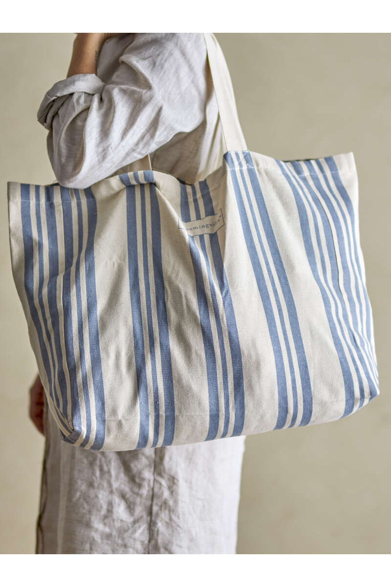 Artikelnummer: 52877Die Trina Einkaufstasche von Bloomingville ist mit ihrer großen Größe und ihrem gemütlichen Design Ihre neue Lieblingstasche für den Einkauf und den Strand. Die weiche Tasche hat eine Innentasche für Ihr Handy. Die Tasche ist aus Baumwolle in einer hellen Naturfarbe mit Streifen in einer frischen blauen Farbe gefertigt. L47xH40xW16 cm